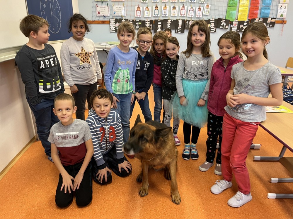 V pátek jsme se zúčastnili krásného výukového programu Dítě a pes - nebezpečné situace. Kromě psovoda pana Mazálka nás vyučoval i německý ovčák Ben. Dozvěděli jsme se, jak se chovat či nechovat k pejskovi při různých příležitostech. Program se nám moc líbil!