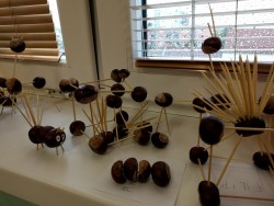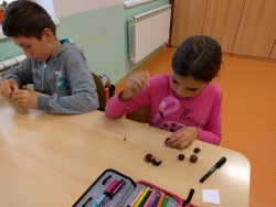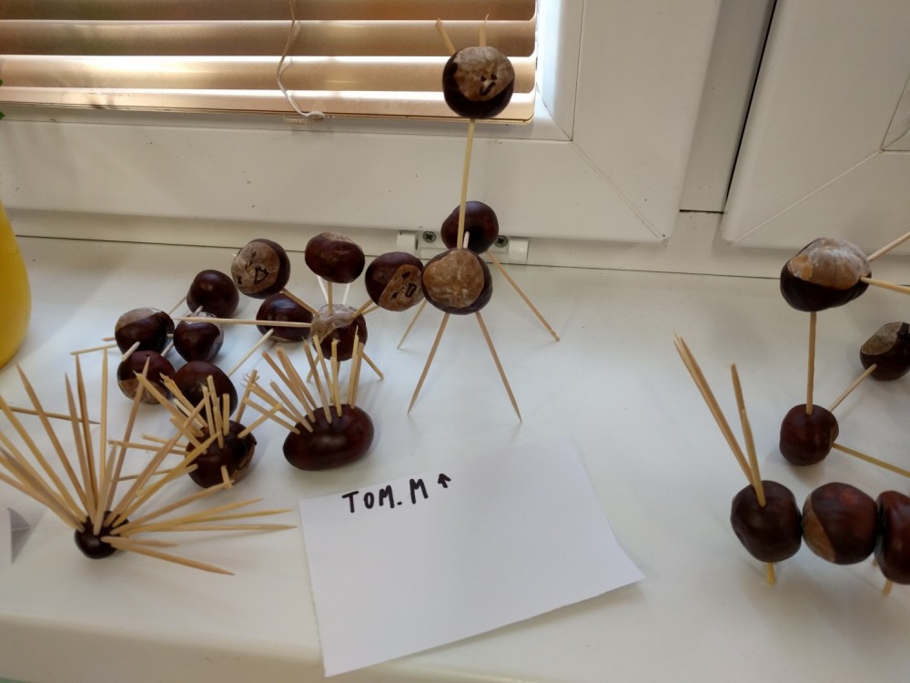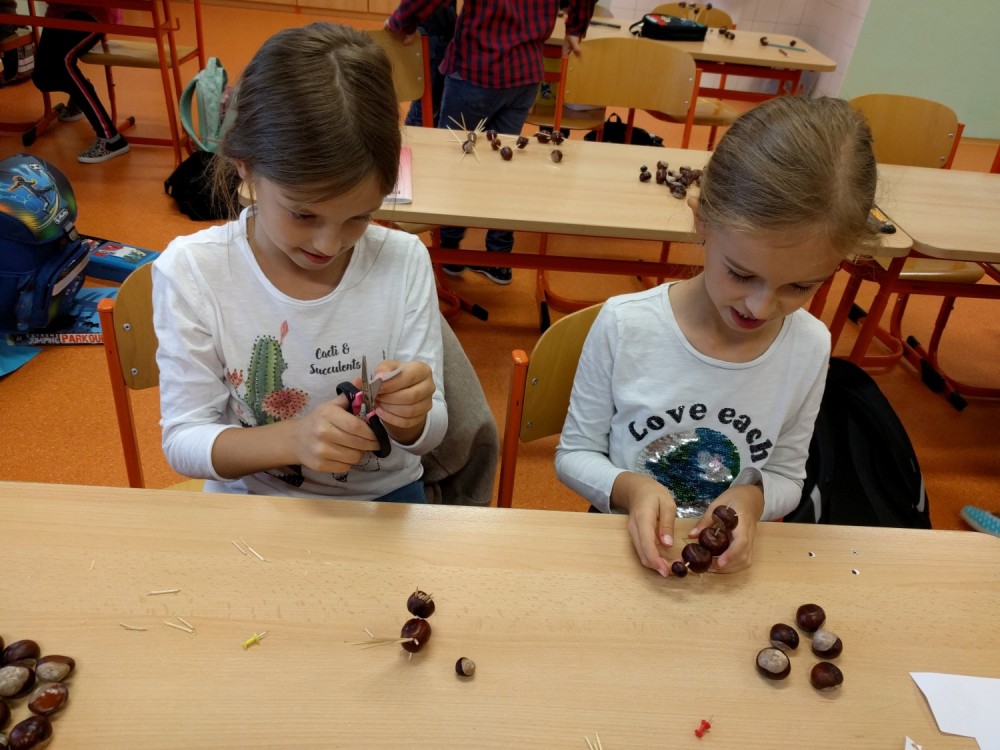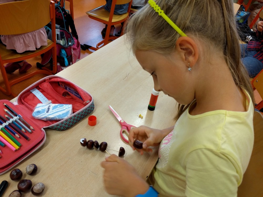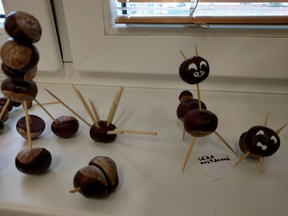 V  pracovních činnostech jsme se pustili do výroby zvířátek z kaštanů. Moc nás to bavilo,zapojili jsme fantazii a ježci, žirafy, housenky a jiná zvířátka se nám hezky dařili. Velká pochvala patří Klárce, která vlastnoručně nasbírané kaštany pro děti přinesla.