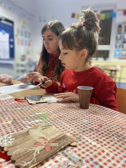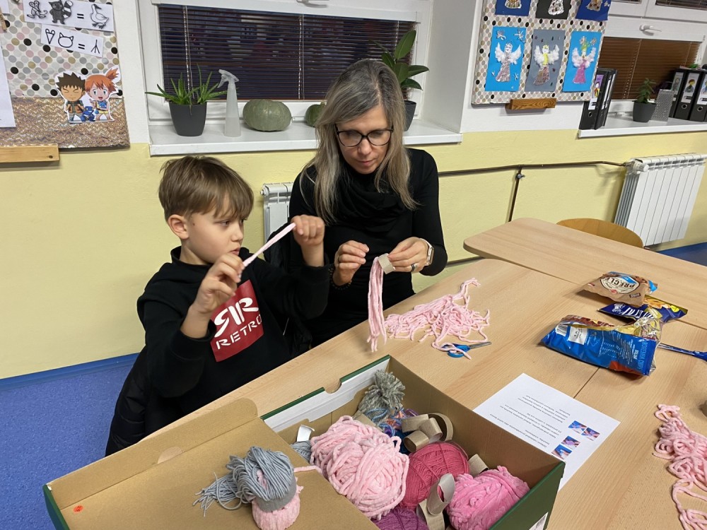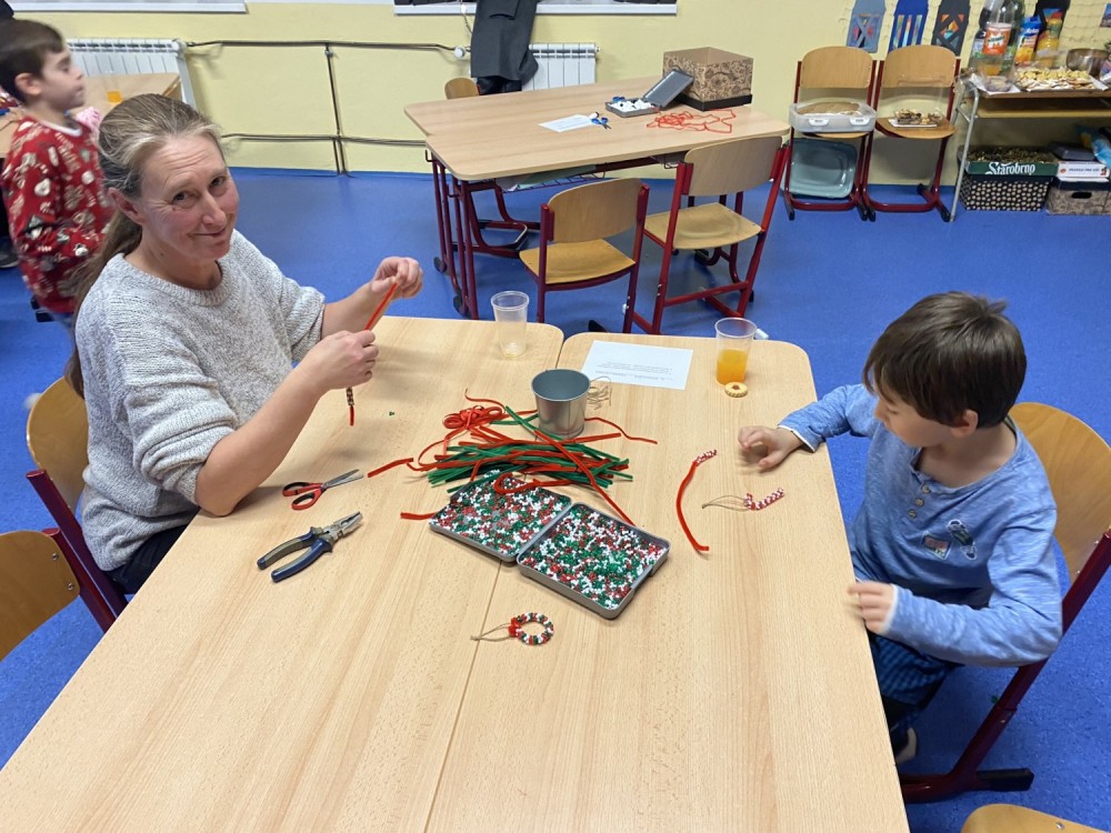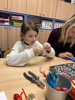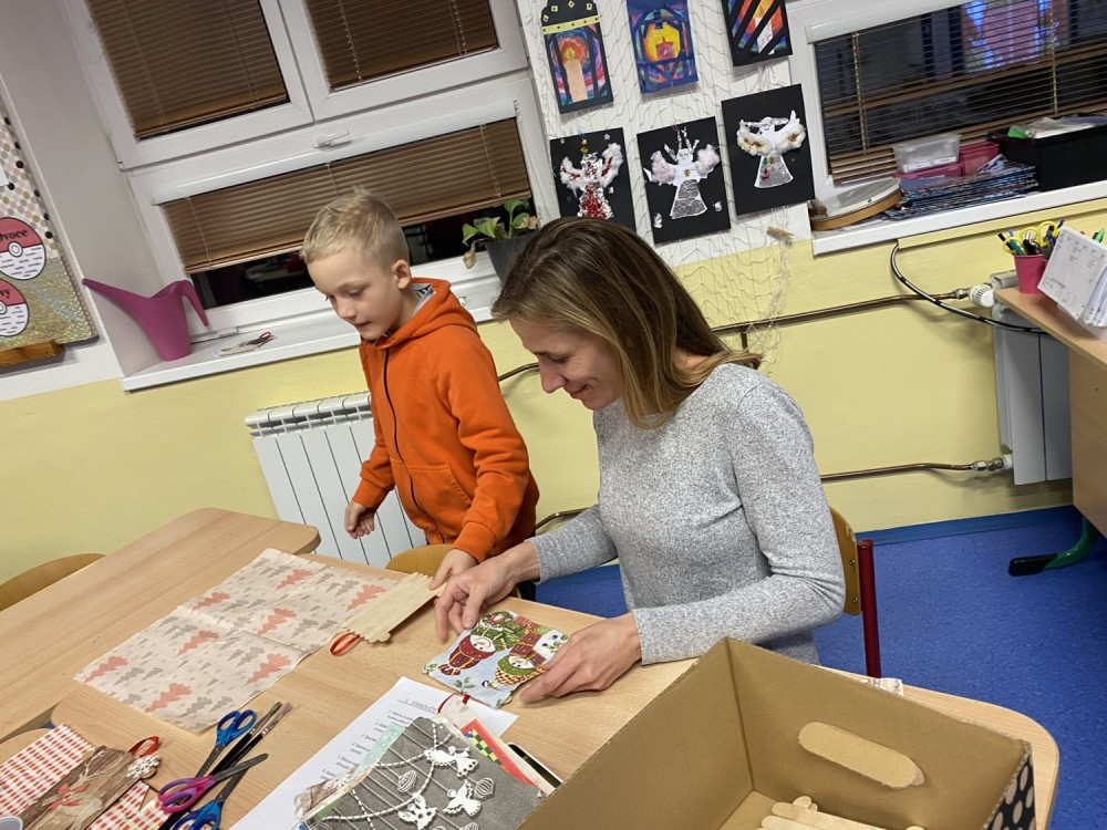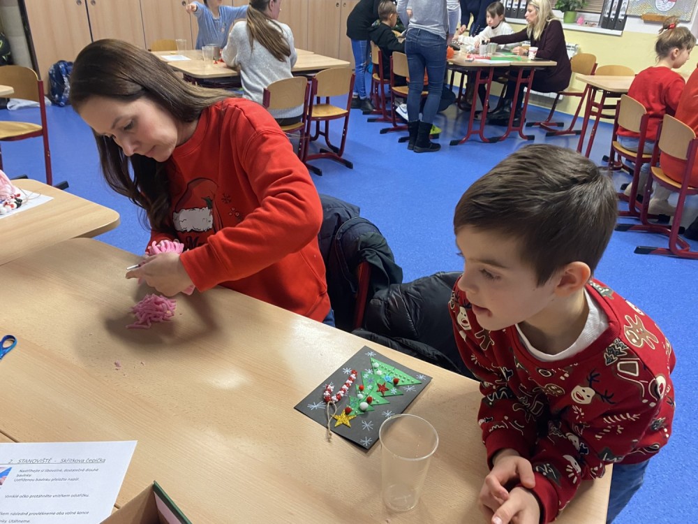 Letos pro nás paní učitelka připravila pět stanovišť, na kterých jsme pracovali s netradičními materiály či složitějšími postupy. Čekalo na nás uzlíkování skřítkovské čepičky, výroba vlastních ozdob z korálků a drátků, sněhuláka z dřevěných komponentů, vytvořili jsme si vánoční přání a vyzkoušeli ubrouskovou techniku na dřevěný podklad.