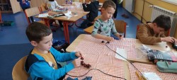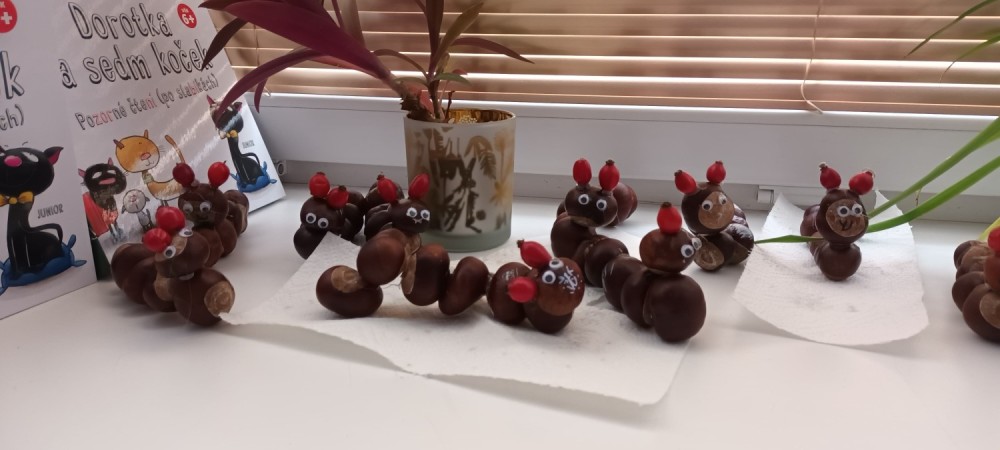 Nápad, který vznikl od dětí a díky dětem. Jednoho dne přišla Ellenka Watzke s taškou plnou kaštanů a nápadem, že něco vyrobíme. Ellenku napadly housenky. Téma jsme měli, ale museli jsme zajistit věci pro výrobu. Další děti donesly tavné pistole, šípky a mohli jsme začít. Při práci s tavnou pistolí mě děti velmi překvapily a moje obavy se rozplynuly. Sice pár drobných spálenin bylo, ale nic, co by nevyřešila studená voda. A výsledek? Můžete posoudit sami.