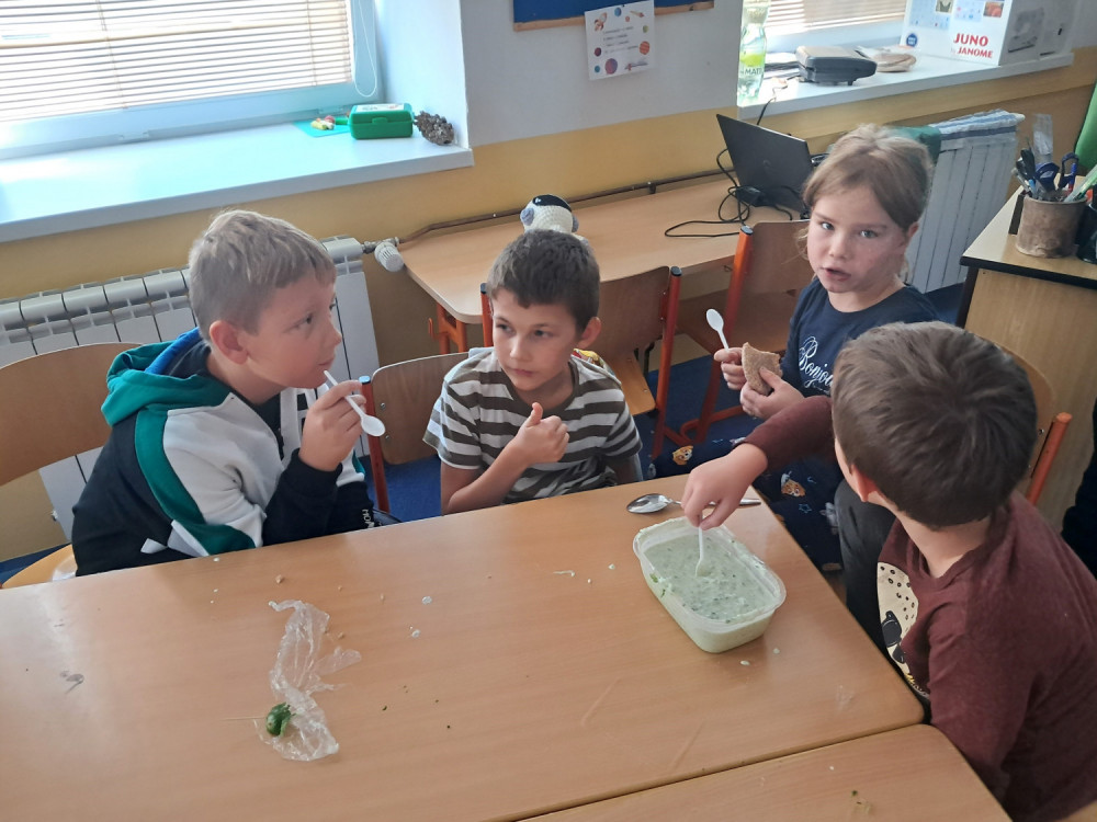 Rádi ochutnáváme a rádi jíme. A proto jsme si připravili pokrm Tzatziki podle receptu v rámci Dne evropských jazyků, kde jsme cestovali do starověkého Řecka. Další týden nás čekala ochutnávka sýrů a příprava jednohubek. Překvapilo nás, že sýr s kozím tvarohem je moc dobrý. Nejvíce nám chutnal čerstvý sýr s medem a semínky - zajímavá kombinace. Děti ji doporučovaly všemi deseti.