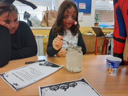 Okolo svátku Halloween a Dušiček jsme si ve třídě udělali "Strašidelný den". Vymýšleli jsme strašidelný komiks, vytvářili jsme rentgen ruky, skládali jsme z lega strašidelné domy a chystali pro BeeBota hororovou stezku odvahy. Čekalo nás i několik strašidelných pokusů - tancující duchové, vzkaz ze záhrobí a elektrický duch.