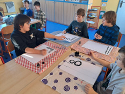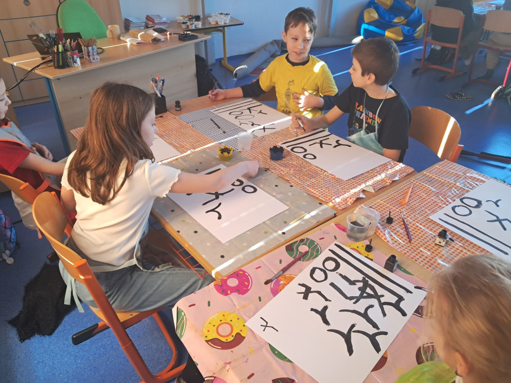 Hlavní částí workshopu byla samozřejmě kaligrafie. Pod vedením lektora se žáci seznámili se základy mongolského písma a měli možnost si sami vyzkoušet psaní. Prvním slovem, které se učili napsat, byl „kůň“ – zvíře, které je pro mongolskou kulturu naprosto klíčové a symbolické. Soustředěně se snažili napodobit tahy štětcem a objevovali krásu a eleganci tohoto starobylého umění.