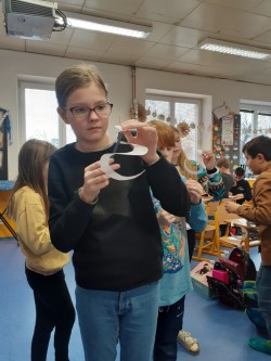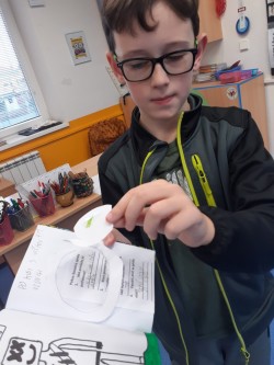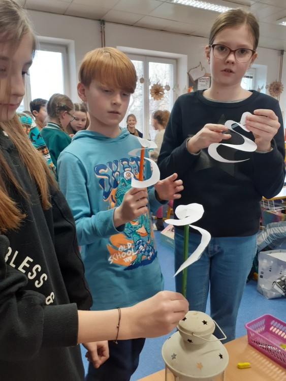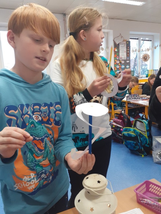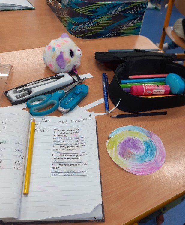 Dnes čtvrťáci zjišťovali, co dokáže teplý vzduch s papírovou spirálou. Z kruhu vystřihli spirálu a takto vytvořeného hádka umístili na tužku s hrotem. Poté přistoupili k nejzajímavějšímu kroku, spirálu - kouzelného hádka umístili nad lucerničku se zapálenou svíčkou. Vzduch zahřátý plamenem stoupal vzhůru a v tomto vzdušném proudu se hádek roztočil. O svém zkoumání provedli řádný zápis do záznamového archu.