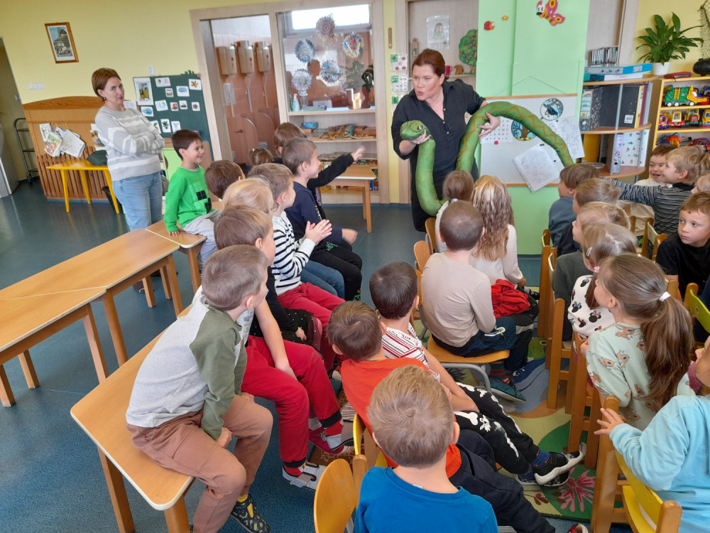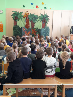 Začátkem listopadu jsme se vypravili navštívit MŠ Modřice. Čekal na nás program v podobě africké pohádky o černouškovi Bum-ti a jeho hledání vody a bubínku. Na svojí cestě potkal spoustu cizokrajných zvířat. Některá z nich dokonce vylezla zpoza paravánu až do publika, které se velmi dobře bavilo. Návštěvu jsme zakončili protažením těla na hřišti MŠ.