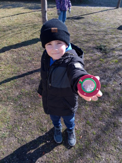 Pobyt na čerstvém vzduchu máme velmi rádi. Na školní zahradu chodíme hrát míčové a pohybové hry. Také ji využíváme k poznávání světa rostlin a živočichů. Probouzející se jarní přírodu si děti přiblížily pomocí lupy.