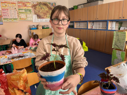 V pracovních činnostech jsme si nejprve nazdobili vlastní květináč, po té jsme do něj zasadili pokojovou květinu - okrasnou kopřivu nebo léčivý rýmovník. Aby se nám sazenice pěkně rozrostly, musíme teď o ně pravidelně pečovat, abychom si domů odnesli zdravé a pěkné pokojovky.