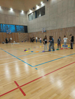 V tělocvičně si žáci vyzkoušeli netradiční úpolové hry, základy parkouru a balanční dráhy. Vyzkoušeli si také brýle simulující účinky drog a alkoholu nebo simulační oblek obézního člověka (20 kg).