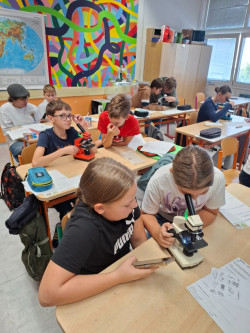 Následovalo mikroskopování – ze senného nálevu jsme pozorovali živé mikroorganismy, nejčastěji trepky. Bylo fascinující sledovat, co se skrývá v kapce vody 💧.