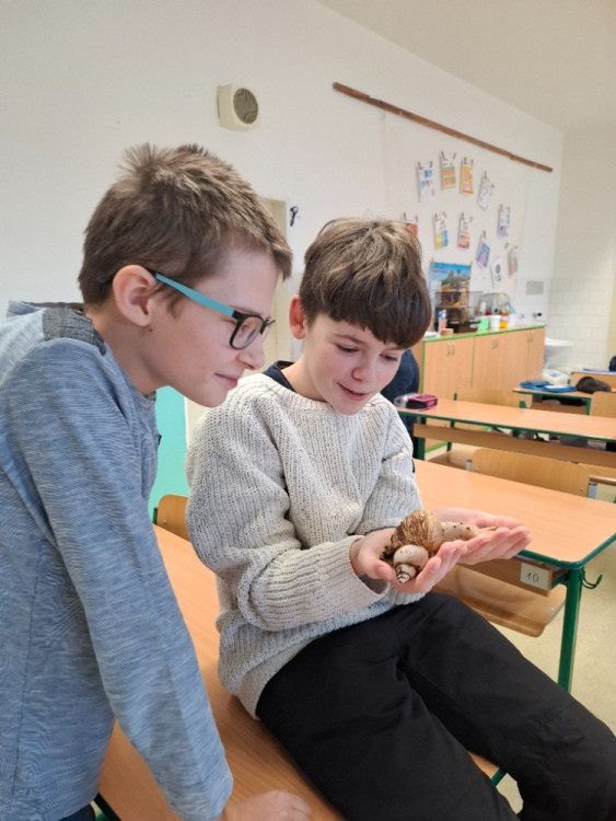Jedním z nejzajímavějších okamžiků byla návštěva, kdy jsme si mohli zblízka prohlédnout africké oblovky 🐌. Tyto obrovské šneky jsme si na chvíli „půjčili“ do třídy, a i když jsme je měli jen jeden den, nadchli nás svou velikostí i klidnou povahou.