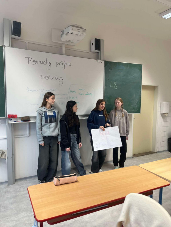 Ve třetí hodině se žáci věnovali příběhům lidí trpících poruchami příjmu potravy. Úkolem bylo identifikovat konkrétní diagnózu, popsat příznaky a zamyslet se nad možnými následky dané situace. Tato aktivita podpořila jejich schopnost analyzovat a vcítit se do problémů druhých.