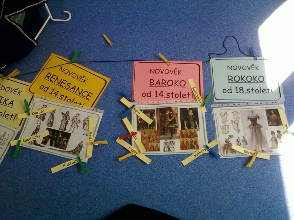 Před velikonočními prázdninami (ve středu 4. dubna) jsme absolvovali výukový program "Historie módy". Přijeli za námi ze SVČ Ivačice a zajímavou formou nás seznámili se základními prvky typickými pro jednotlivá historická období. Přednášející také děti pochválila, jak se orientují na časové přímce a mají probíranou látku pěkně upevněnou a naučenou. Na závěr si mohli vyzkoušet kostýmy z jednotlivých období.