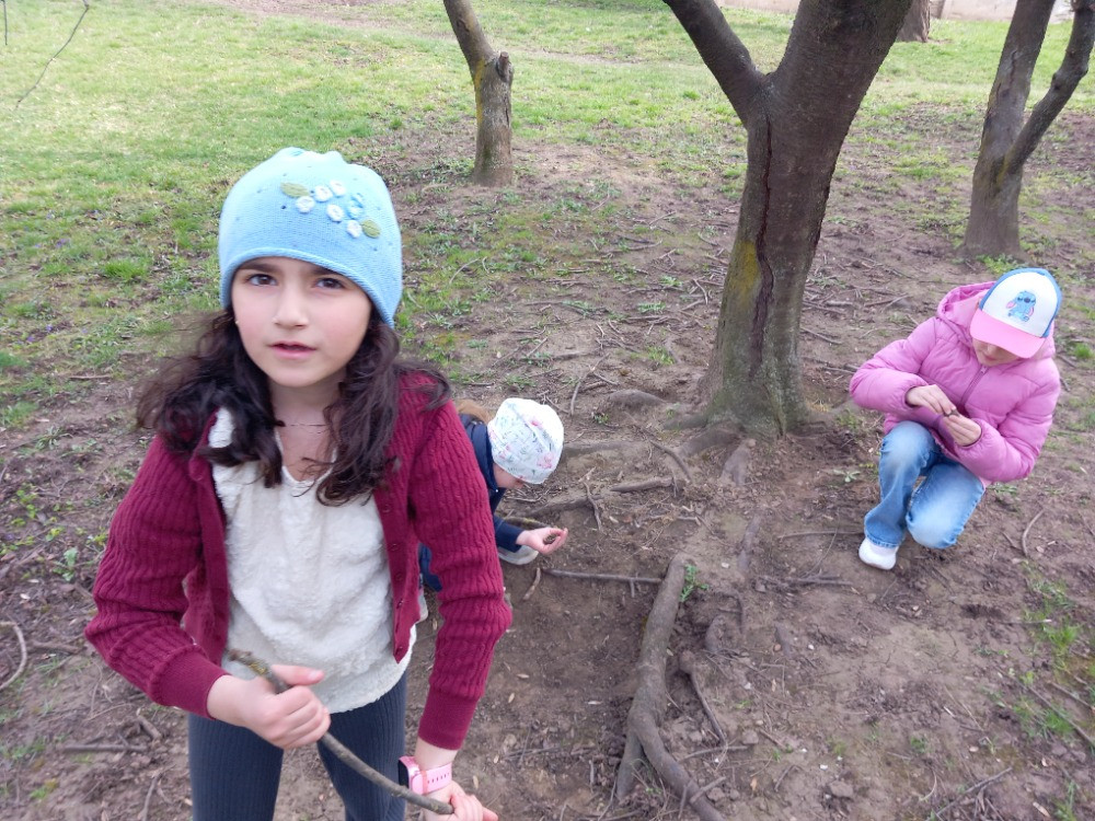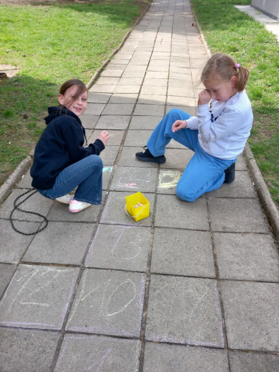 Na hřišti Plácek nejraději hrajeme malou kopanou nebo stavíme skrýše pro zvířátka. Tentokrát jsme si na chodník nakreslili několik skákacích panáků, jednoho až do čísla 100 s překážkami a někteří si tohoto panáka opravdu 100x skočili!