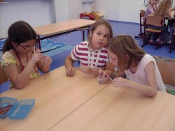 Konečně nám začal i kroužek Výroba šperků. Dnes jsme se učili navlékat korálky do tvaru koleček - nejmenší prvňáčci pracovali s většími korálky, větší holčičky s těmi nejmenšími. Vyráběli jsme náramky. Dětem se velice vyvedly:)))