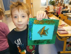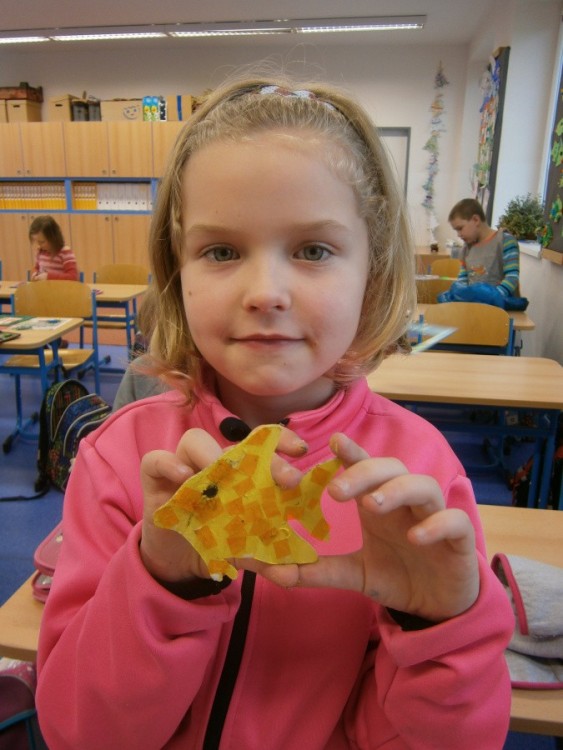 12. 1. 2015 V 1.oddělení použily děti rozstříhanou PET láhev k vytvoření obrázku s mořskou rybkou. Málokdo by poznal, že na papír lepily různobarevné ústřižky PET láhví. Obrázky se všem dětem povedly. 12 / 1 / 2015 VS