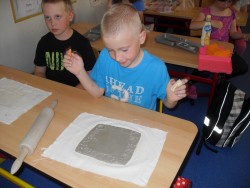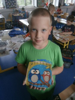 Děti z 1.oddělení s pomocí paní Kateřiny Veselé vyrobily z hlíny kachlíky, které po vypálení natřely burelem a polepily ubrousky.