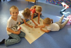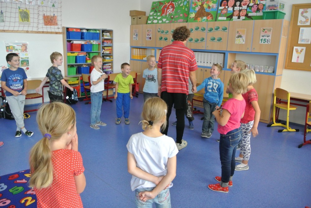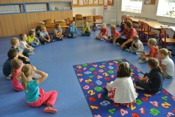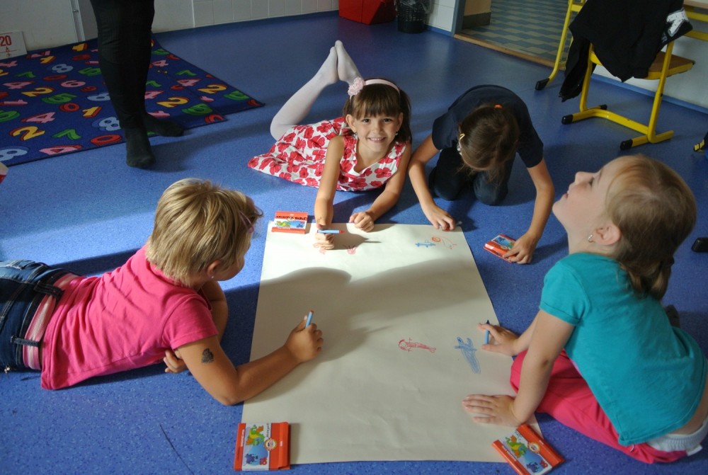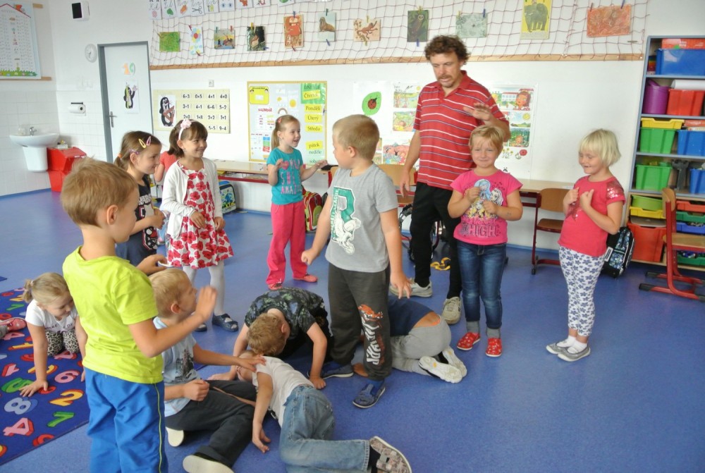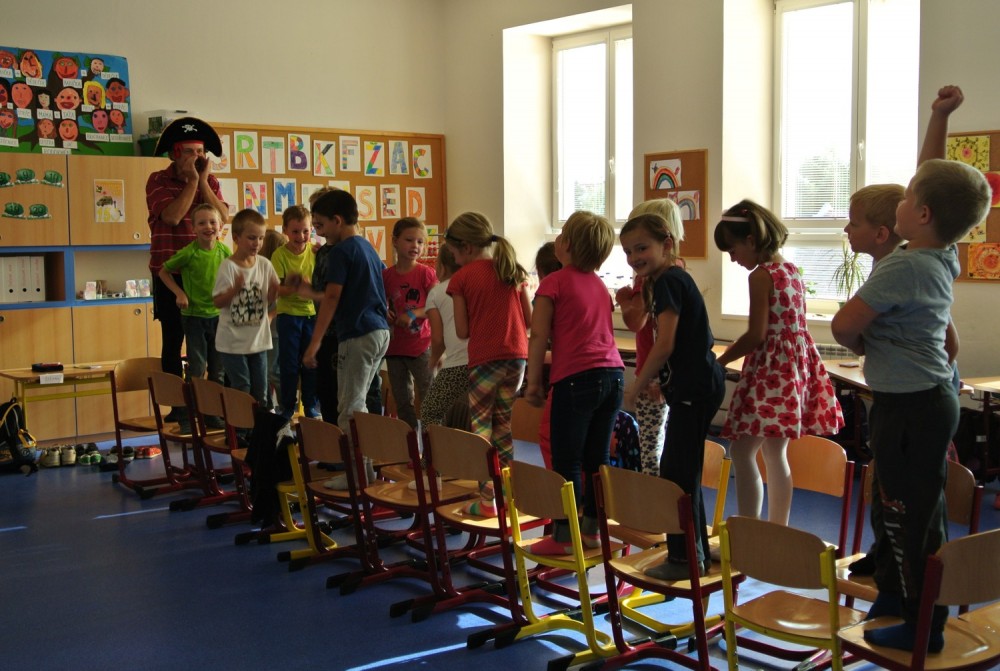 Dnes nás navštívil pan Libor, který nám připravil naprosto úžasný program, abychom se seznámili a lépe poznali. Nejprve jsme hráli hry v kruhu, abychom si lépe zapamatovali jména spolužáků, pak jsme se proměnili v auta a zajeli si do ZOO, cirkusu, atd. Ve druhé hodině jsme se proměnili v námořníky. Společně jsme pluli na lodi, plavali v moři a to, co jsme v něm potkali nebo zahlédli, jsme pak ve skupinkách namalovali.