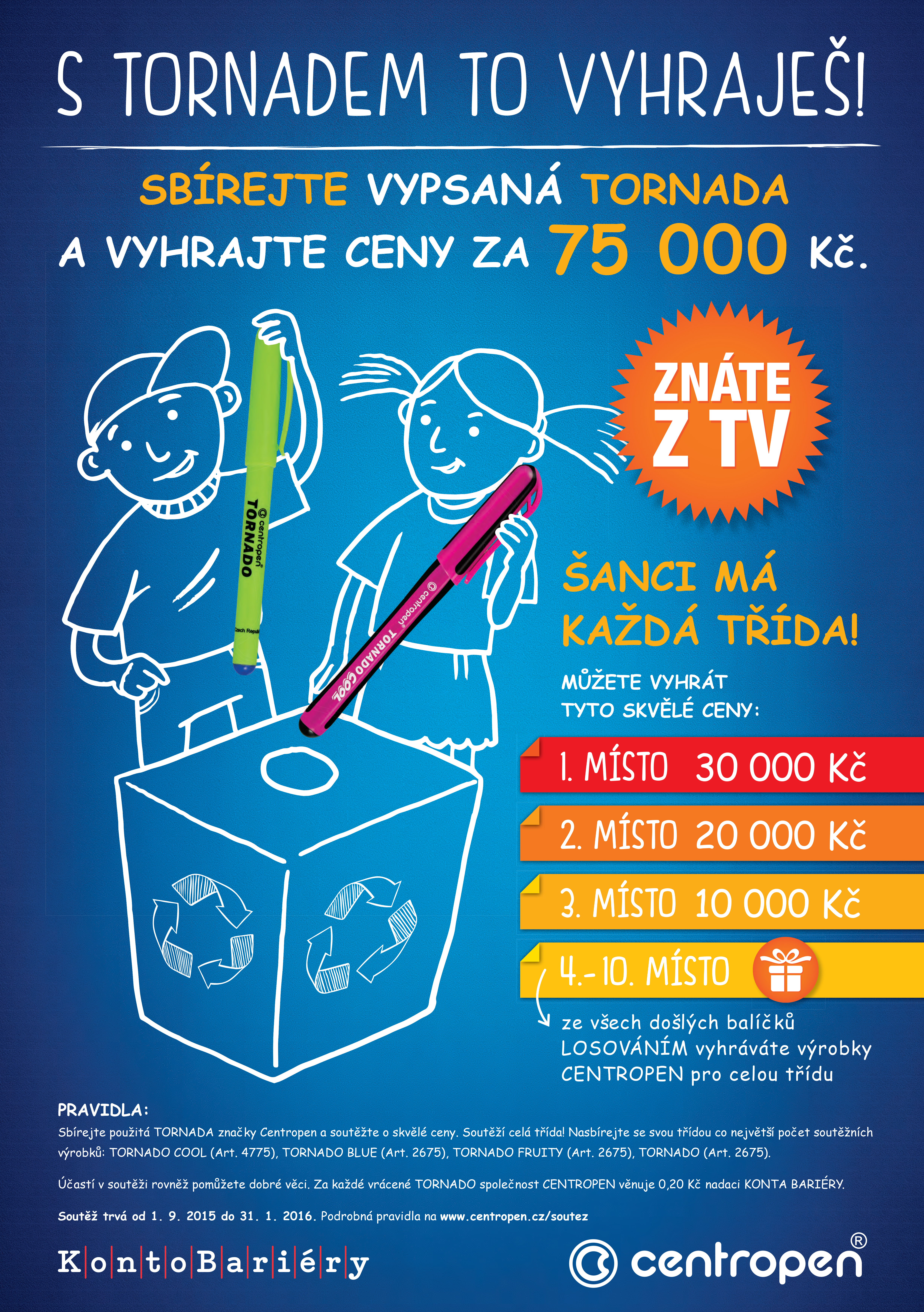 Rozhodli jsme se konat dobré skutky a zároveň trochu soutěžit. Inspirací pro nás byl příběh z knihy Šimsa, kterou nyní společně ve škole čteme. V jedné z kapitol Šimsa dělal dobré skutky a my jsme se rozhodli, že také něco vykonáme. Vybrala jsem pro nás soutěž s Centropenem. Sbíráme už skoro dva měsíce vyschlá pera. Z každého pera jde 0,20 Kč na Konto bariéry a navíc dojde k ekologické likvidaci per. Podpořte prosím naše dobré činny a pokud máte vyschlé pero, můžete jej poslat po žácích 2.B do školy. Soutěž a sběr končí koncem ledna. Více informací v přiloženém plakátu. Děkujeme!