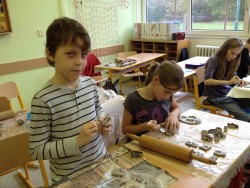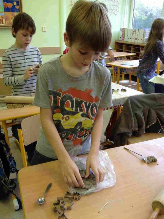 Dnes to vypuklo! Zahájili jsme přípravy na Vánoční jarmark. Žáci přišli do školy vybaveni válečkem a vykrajovátky na cukroví. Takto vyzbrojeni jsme se pustili do díla. Dnes jsem pracovali s kombinací keramické hlíny a skla. Pod šikovnýma rukama žáků začaly vznikat nádherné ozdoby na vánoční stromeček. Velmi chválím žáky za odvedenou práci.