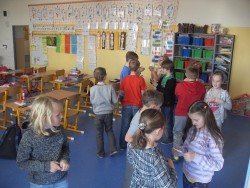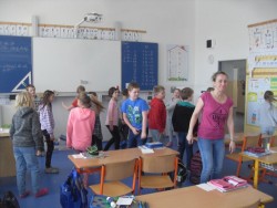 Nemusíme se vždy učit jen v lavicích. Například v angličtině využijeme celý prostor třídy opravdu naplno. Nejprve si nakreslíme diktát (ano - opravdu kreslíme - podle diktovaných pokynů), potom se anglicky protáhneme a nakonec zazpíváme písničky. Přitom si nenápadně upevníme slovní zásobu :-).
