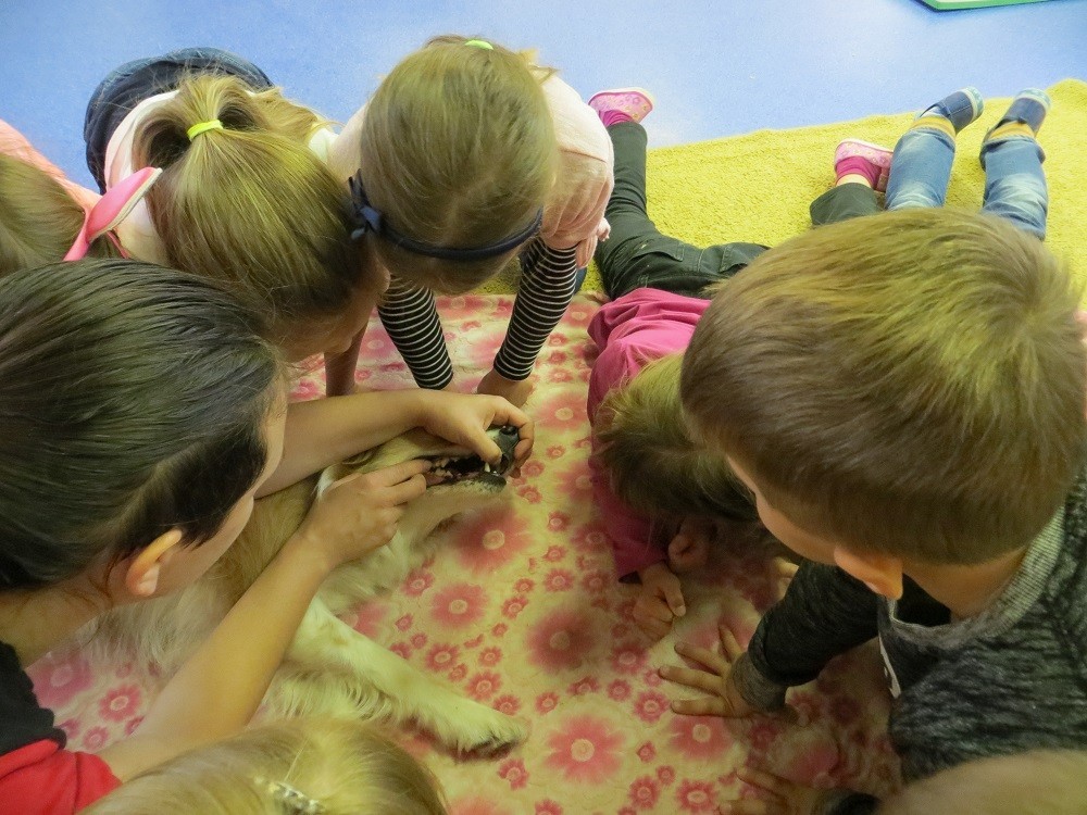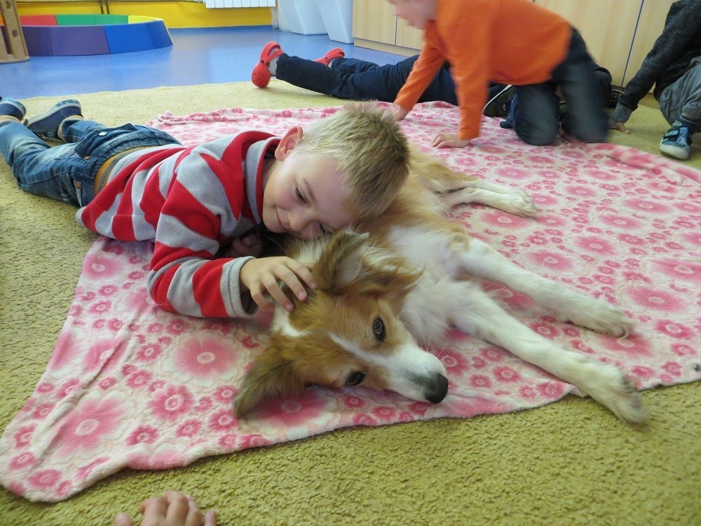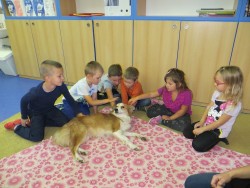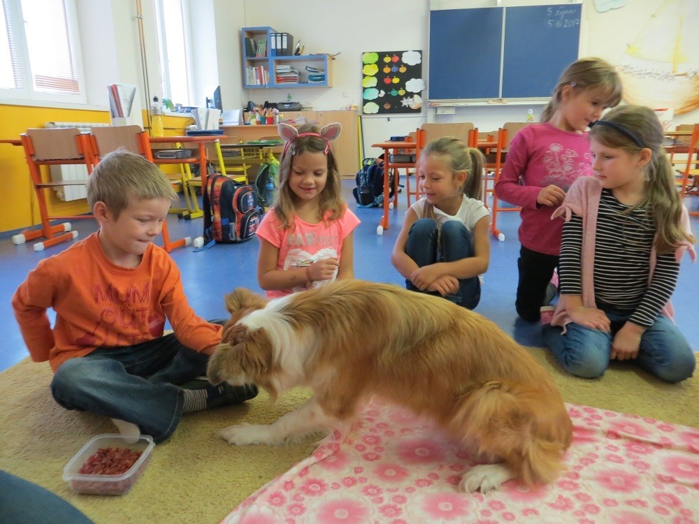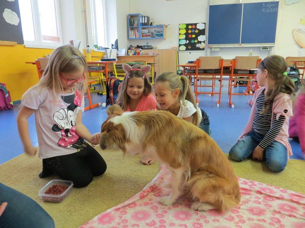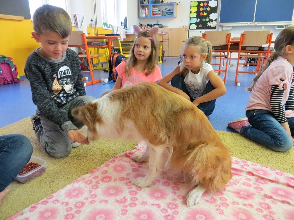 Od čtvrtečního rána jsme s netrpělivostí vyhlíželi očekávanou návštěvu. Děti si krátily chvíli představováním si, jak asi Kajka vypadá, jakou má barvu srsti a jestli nebude vyšší než oni. První setkání s fenkou Kajkou a paní canisterapeutkou Blankou bylo radostné. V průběhu hlazení, mazlení a tulení se s Kajkou jsme si také povídali o tom, jak správně se psy komunikovat, co potřebují a jakou volit vhodnou potravu. Krmení jsme si vyzkoušeli i prakticky.