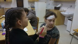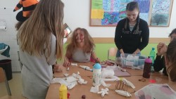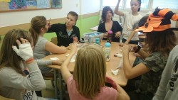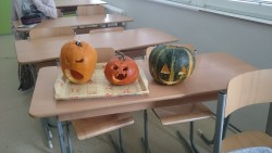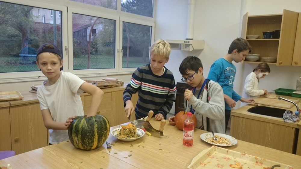 Ve středu 25.10.2017 jsme se pustili do výroby. První počin začal ve školní kuchyňce, a to ukuchtěním dýňové polévky a upečením čertovských prstů z listového těsta a mandlí. Někteří uplatnili svůj talent u dlabání dýní a vytvořili tak krásnou halloweenskou lucerničku Jack - o - Lantern. Karolína Troubilová se pak " podepsala" na našich obličejích i jiných částech těla dokonalým halloweenským make-upem. Ve třídě jsme už jen vyrobili malé mumiáčky a knihu kouzel. Snad nám přinesou všechna ta kouzla hodně štěstí.