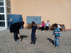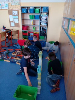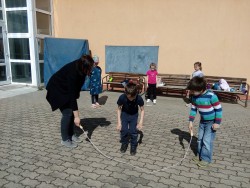 odpoledne na školním hřišti Benešova. Skáčeme přes gumu, švihadlo, hrajeme míčové hry. V budově si hrajeme se stavebnicí, zvířátky, hlavolamem.