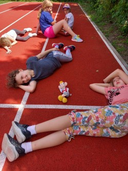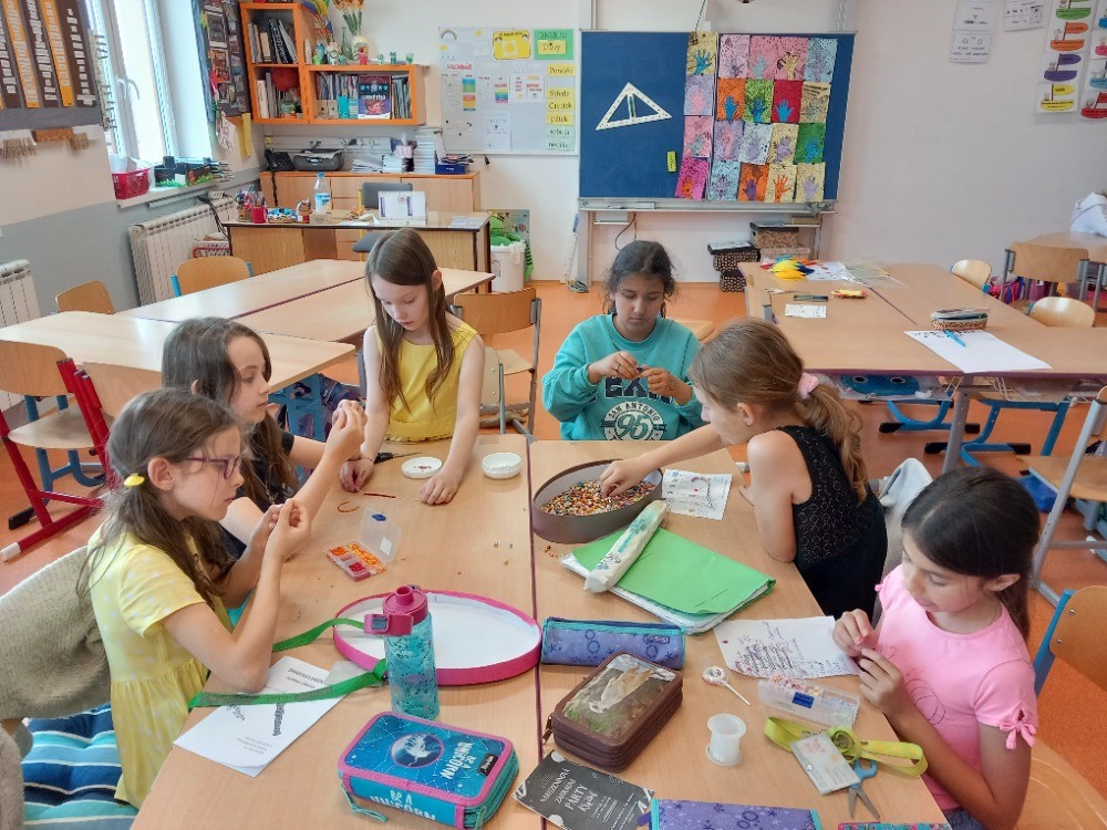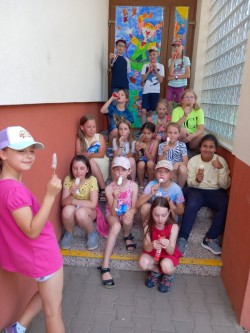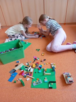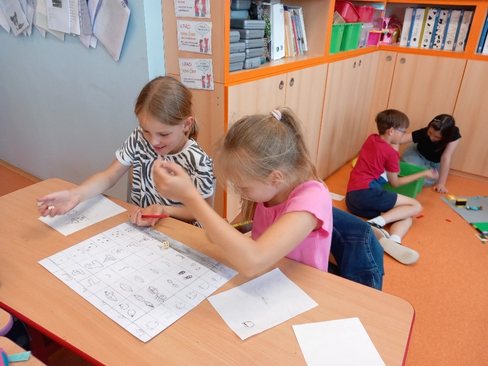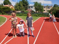 V červnu jsme se věnovali našim oblíbeným činnostem. Navlékali jsme náramky a náhrdelníky z korálků. Stavěli jsme si z Lega. Kreslili podle vlastní fantazie. Na školním hřišti hráli kopanou s 6. oddělením. Nebo jsme si hráli na školu, na rodinu a odpočívali ve stínu. Také jsme si šli koupit do obchodu zmrzlinu a pověděli jsme si něco o penězích a nakupování.