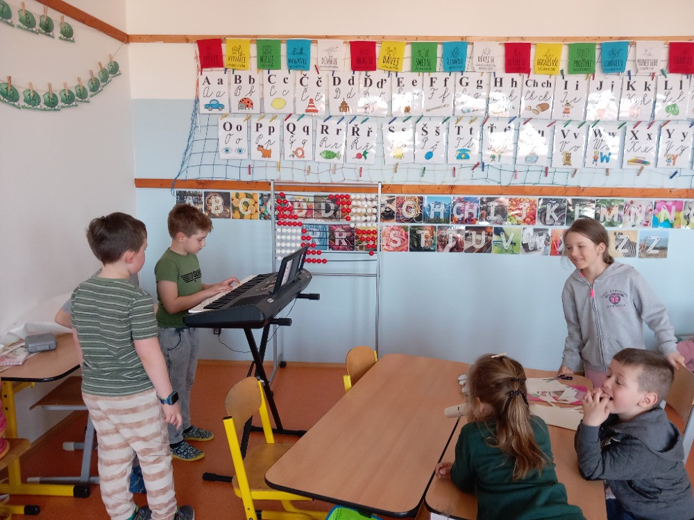 Pokračujeme ve čtení pohádky z knížky od Jiřího Žáčka "Krysáci". Další dvě kapitoly nám opět čte babička Jiřinka Rousová. Po čtení jsme po dlouhé době vyrazili na školní zahradu, kde jsme si zahráli na honěnou a malou kopanou. A toto hezké odpoledne nám zpestřil náš spolužák Maty hrou na přenosné klávesy.