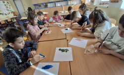 Společně tvoříme " jarní domeček" z dřevěných špachtlí. Jednotlivé díly se slepily tavnou pistolí a základ domečku je na světě. Akrylovými barvami vybraných ostínů jej natíráme. Po zaschnutí nalepíme látkové květy se sušenou dekorací.