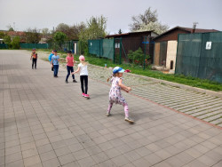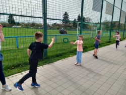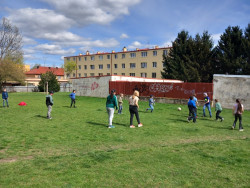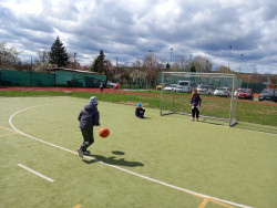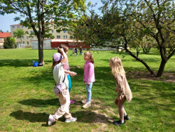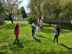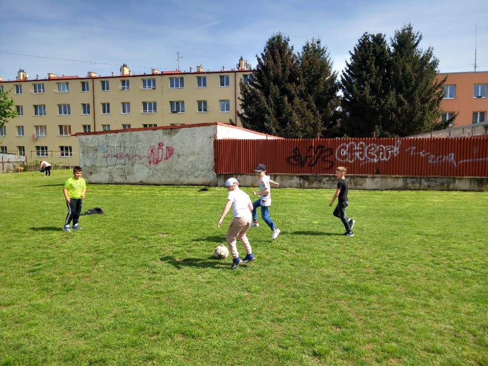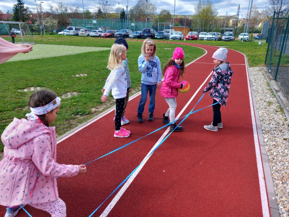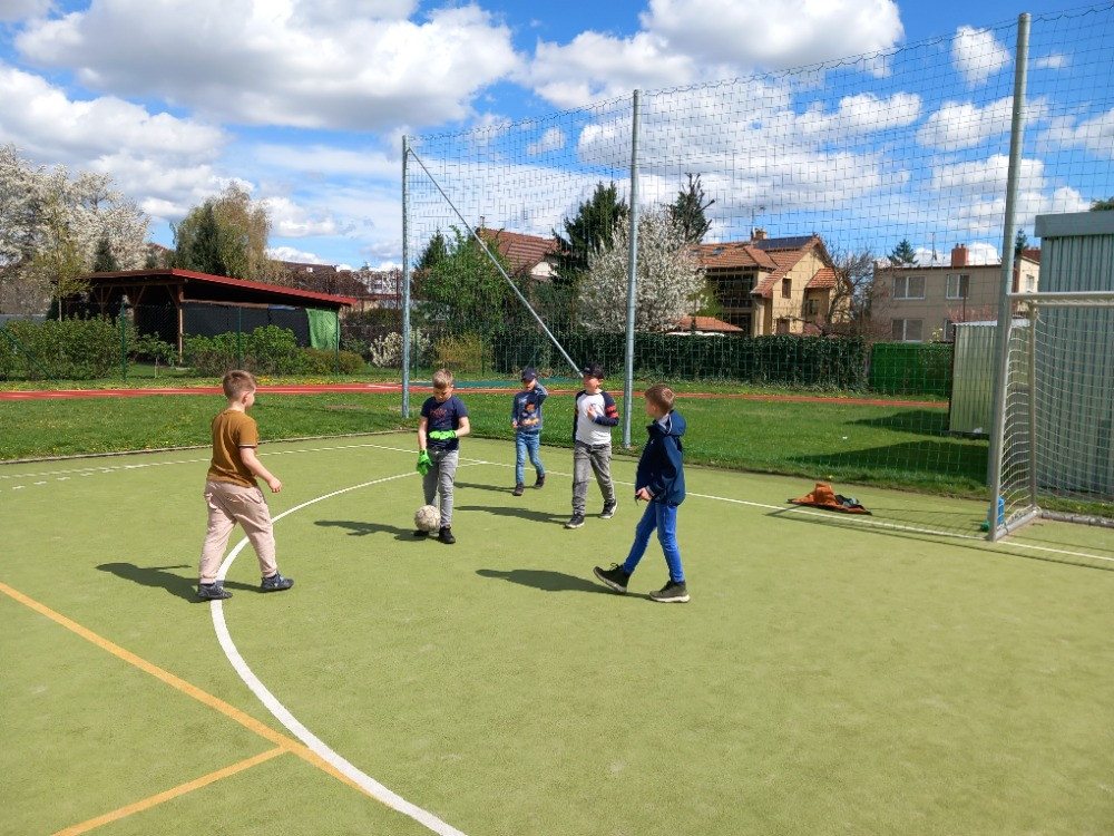 Jsme rádi, že nám počasí přeje a můžeme chodit ven každý den. Na Plácku hrajeme na honěnou, na schovávanou a malou kopanou. Byli jsme si zasoutěžit ve dvou týmech v hodu ringokroužkem. Na hřišti Benešova poměřujeme své síly a dovednosti v kopané se jinými spolužáky nebo skáčeme přes gumu a vymýšlíme si různé pohybové hry se švihadly, gumou a míčem.