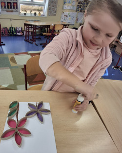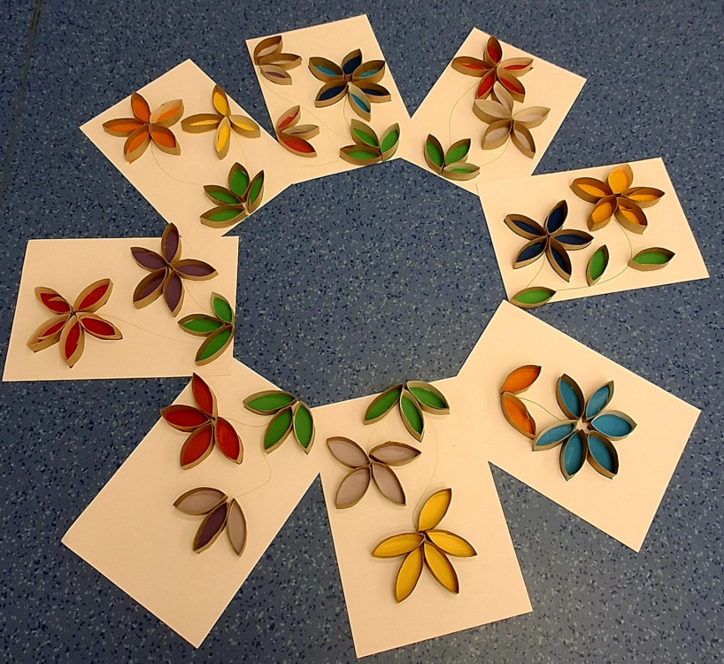 S dětmi jsme tvořili květiny tzv.3D. Předem nastříhané proužky z role toaletního papíru jsme nejprve nalepili na barevný papír, vystřihli, poskládali tvar květu a opět nalepili na tvrdý bílý karton. Fixem dokreslili stonek a máme hotovo🙂.