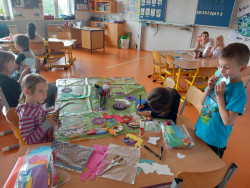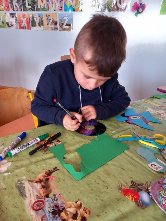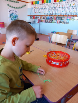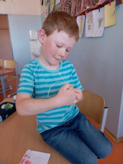 V květnu jsme se pustili do tvoření rybiček a "šneků" ze starých cd. Také se postupně seznamujeme s pletením přívěsků na klíče z barevných bužírek. Zatím se trpělivě učíme plést jedním způsobem, a to hranatou "bužírku". Začíná se nám dařit a máme z toho velkou radost :-)