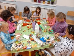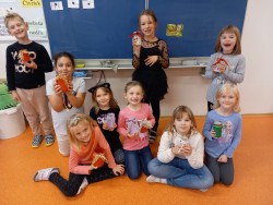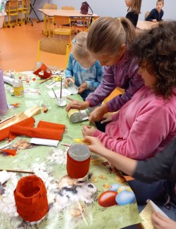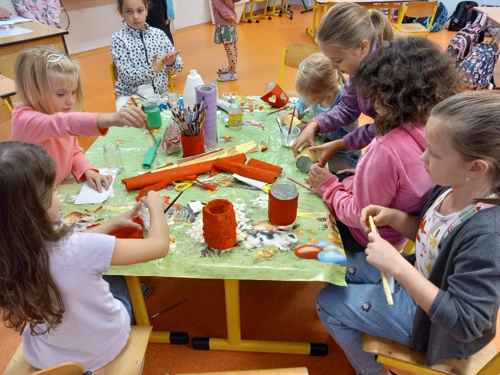 Už před návštěvou hřbitova jsme začali tvořit lucerničky ze zavařovacích skleniček. Dalo nám docela práci naměřit si papír a správně ho nalepit na sklenici. Lucerničky jsme zdobili s pomocí starších kamarádů nebo paní vychovatelky. Tvoření nás moc bavilo a někteří si vyrobili víc lucerniček, které mohou sloužit i jako svícen do bytu či domu.