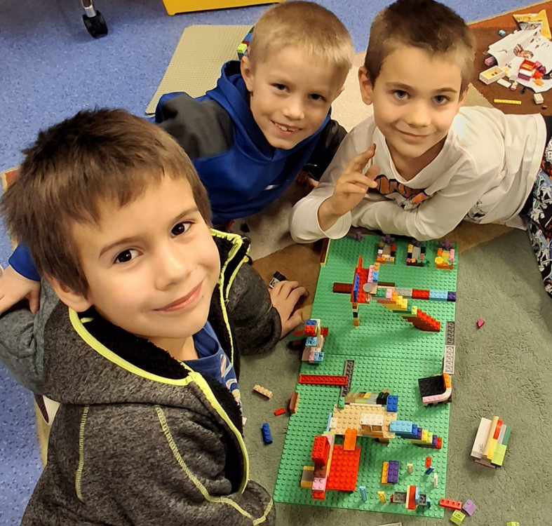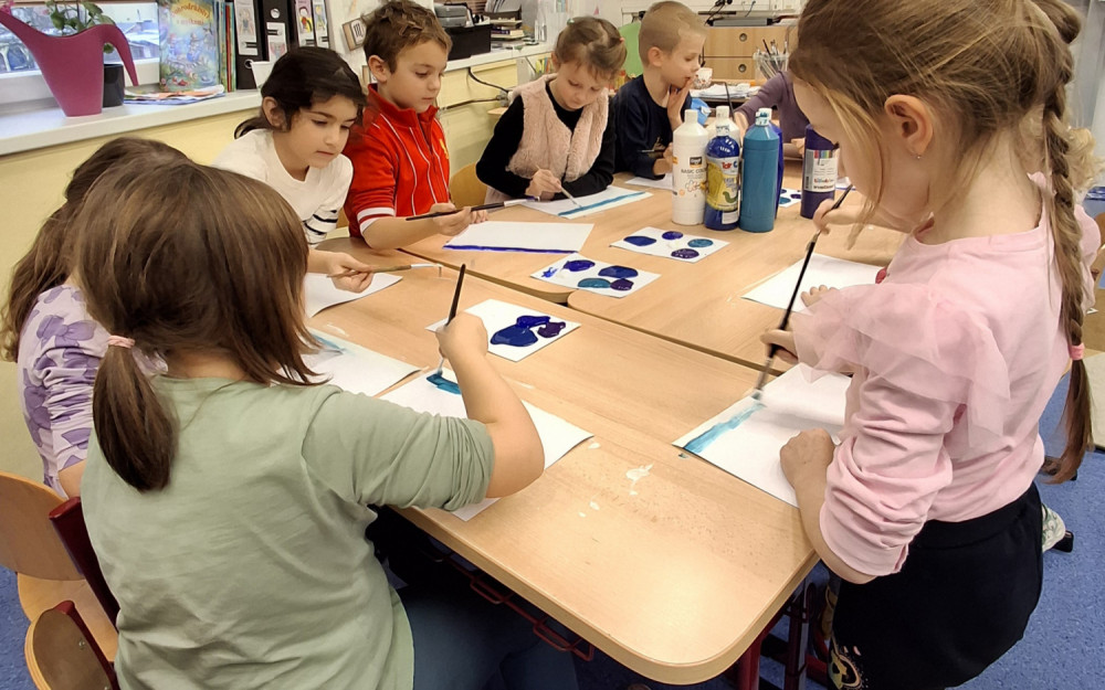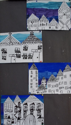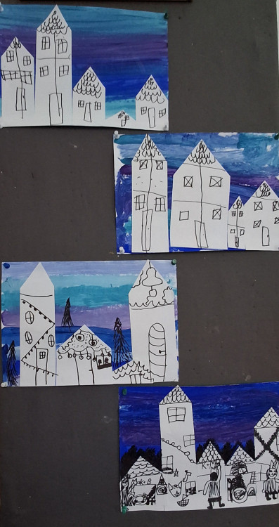 "Město Modřice v zimním kabátu", bylo téma našeho  tvoření. Na tvrdý karton jsme štětcem  malovali odstíny modré a fialové temperovými barvami, aby nám vznikla ta pravá zimní obloha. Po zaschnutí jsme nalepili z bílého papíru vystřižené domy a černým fixem je vymalovali podle naší fantazie🙂.