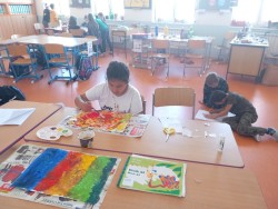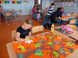 Zapouštíme temperové barvy na výkresy a z nich tvoříme listy okrasného stromu platanu.