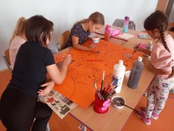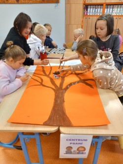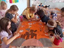 Na dva oranžové plakátové kartony pak malujeme strom a zříceninu hradu Brníčko. Halloweenský