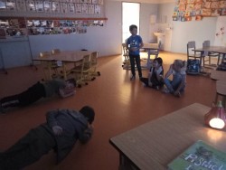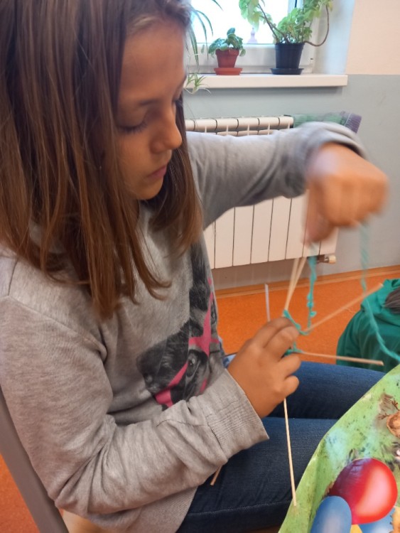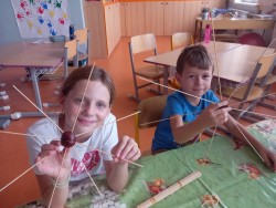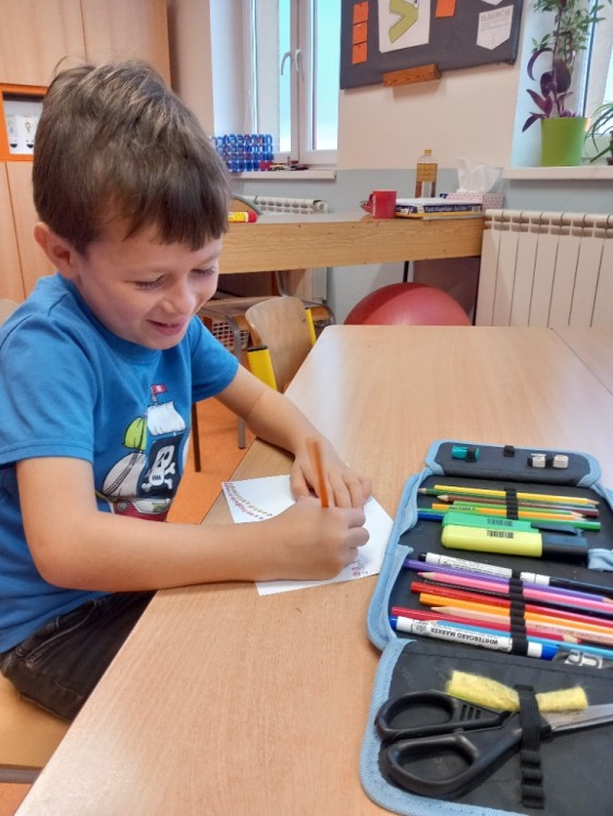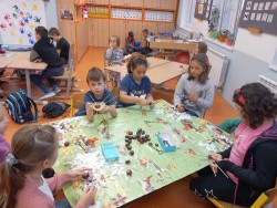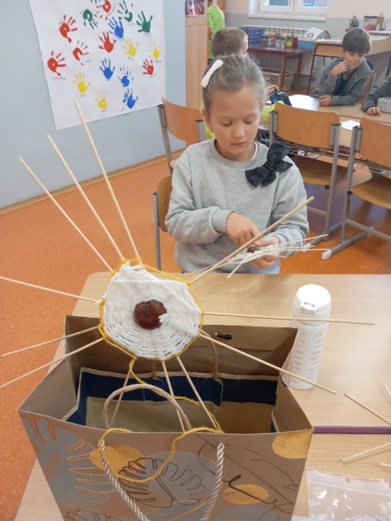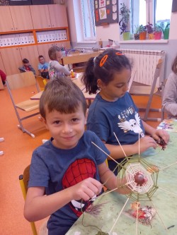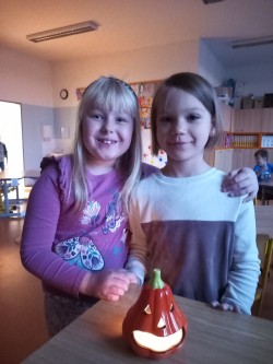V ranní družině rádi pozorujeme východ slunce. Jeho barvy, i to, jak se mění. Protože ještě bývá ráno tma, rozhodli jsme se, že budeme půl hodinku relaxovat potmě. Rozsvítili jsme si v podzimní keramické dekoraci svíčku, povídali jsme si a zpívali ukolébavky s kytarou. Moc se nám to líbilo a určitě si takovou chvilku ještě zopakujeme. Jinak se v ranní družině věnujeme stolním hrám, kreslíme si podle své fantazie nebo tvoříme. Nedávno jsme se vrhli na pavučiny z kaštanů, špejlí a vlny a práce se nám opět dařila a moc nás bavila.