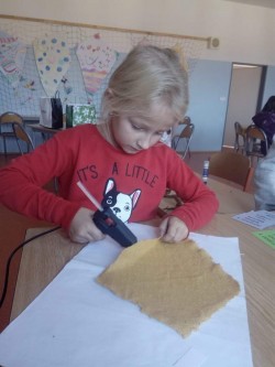 pracovat se šídlem a tavnou pistolí, práce nám šla pěkně od ruky:-)