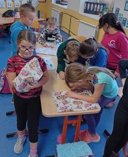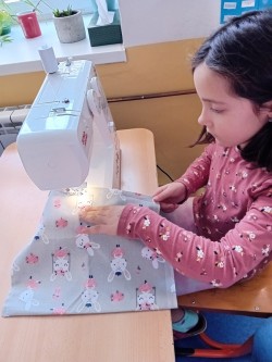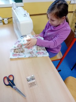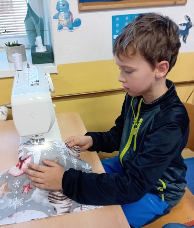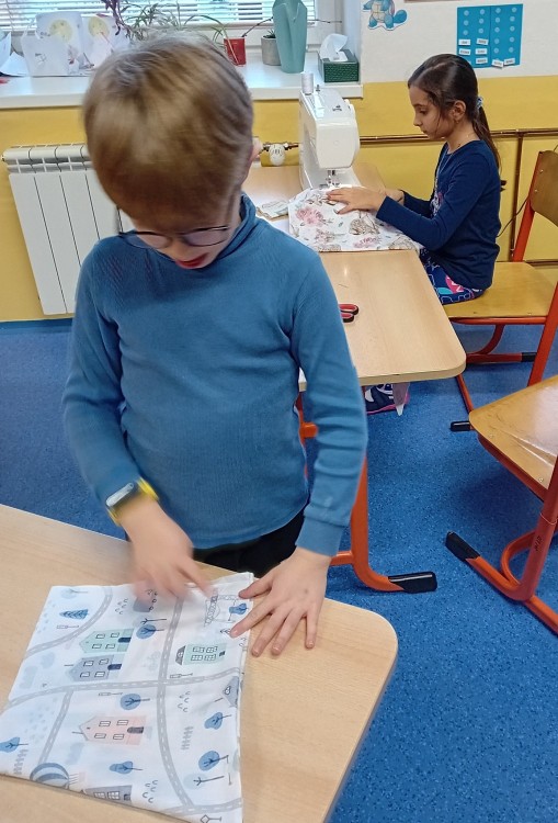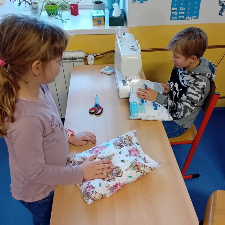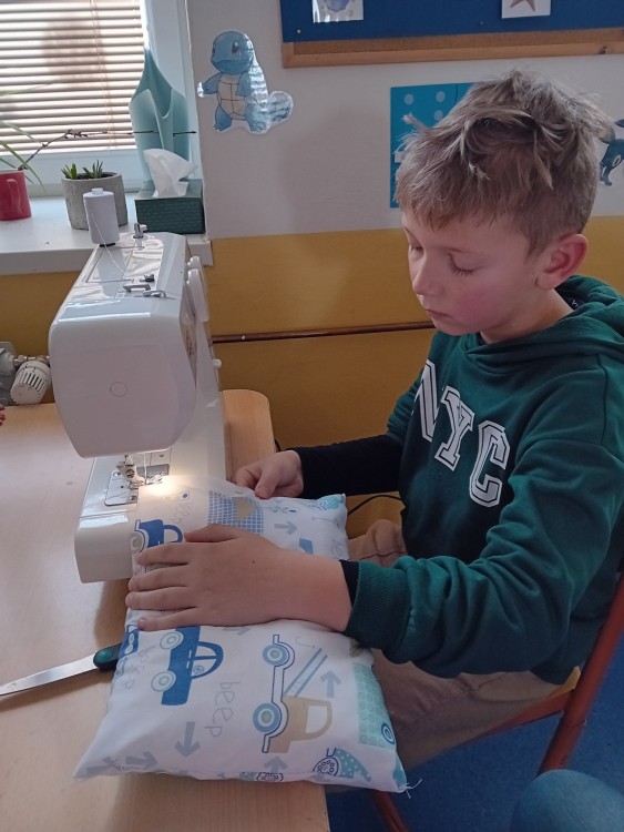 5. 1. 2024 2. oddělení - šijeme polštářky, náplň je vhodná pro alergiky - zakoupeno v textilu u paní Havlátové. 7 / 1 / 2024 KV
