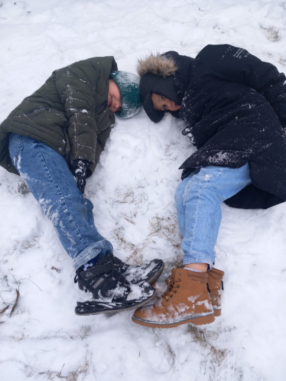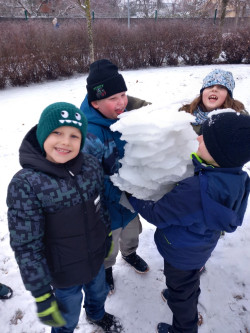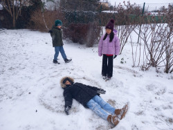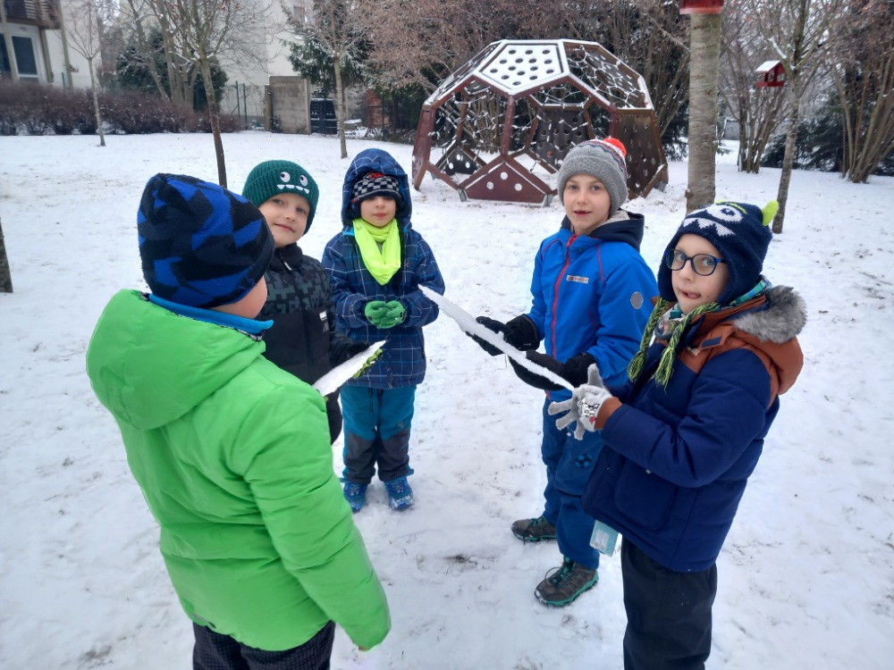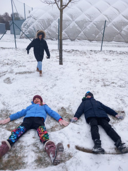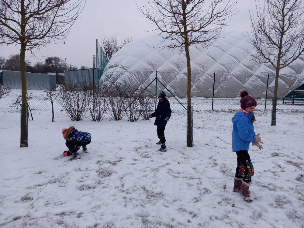 Konečně napadl sníh a tak jsme si jej užili hned po obědě. Dělali jsme andílky u altánu, sbírali jsme kusy zmrzlého sněhu na zahradě a honili se na sněhu. A opět jsme nasypali do krmítek slunečnicová semínka opeřeným obyvatelům naší zahrady.