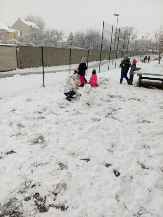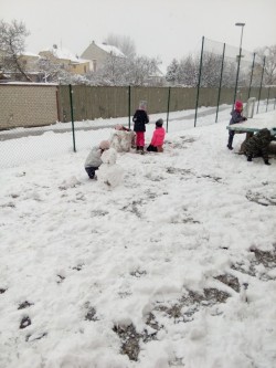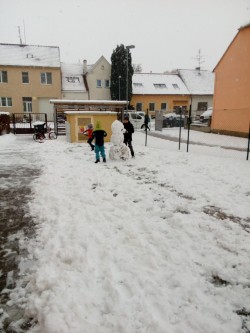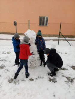 Tento týden nás potěšil sníh - stavíme sněhuláky.