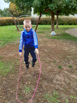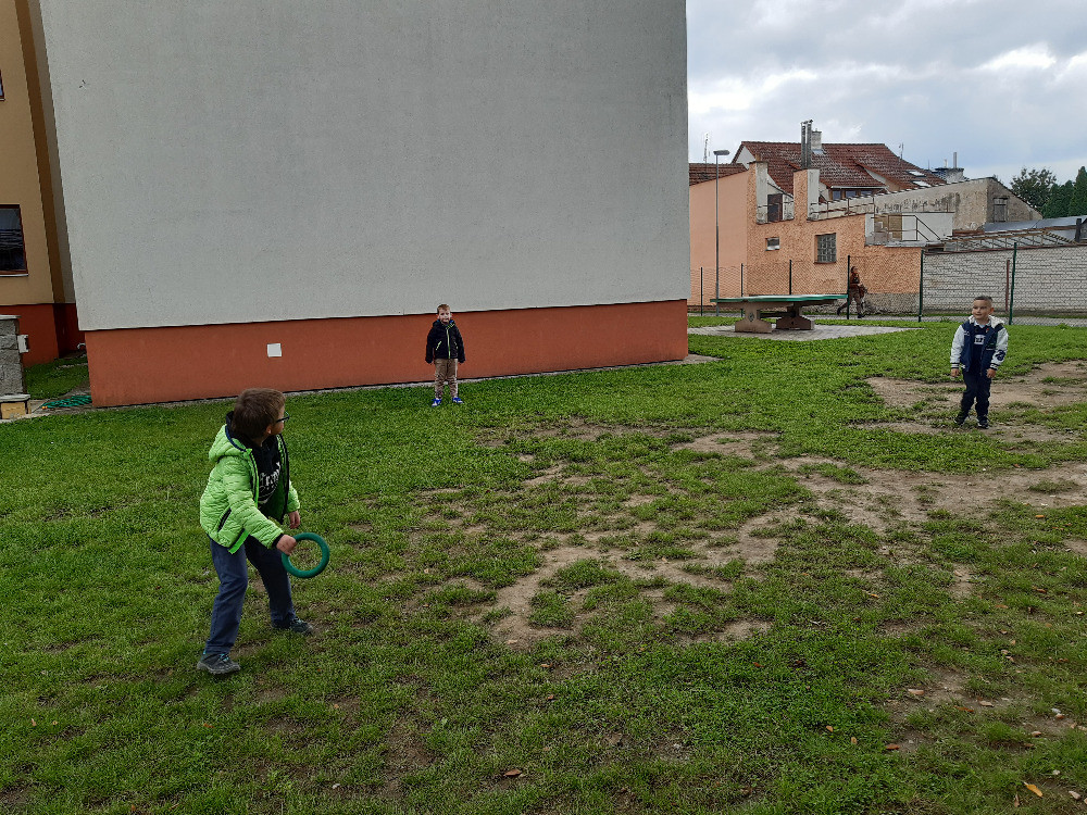 Pěkné podzimní počasí jsme využili k venkovním sportovním aktivitám. Například jsme procvičovali házení a chytání míče, seznámili se s ringem a trénovali skok přes švihadlo.