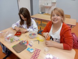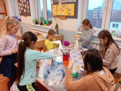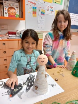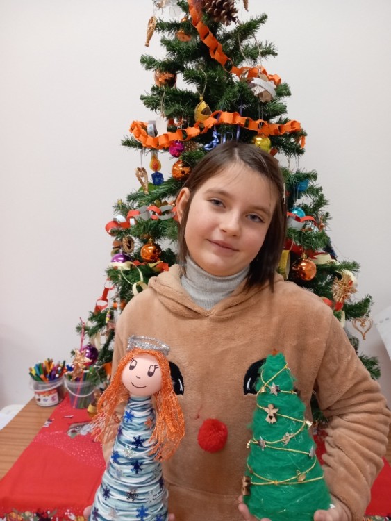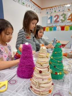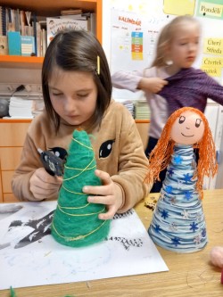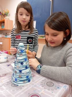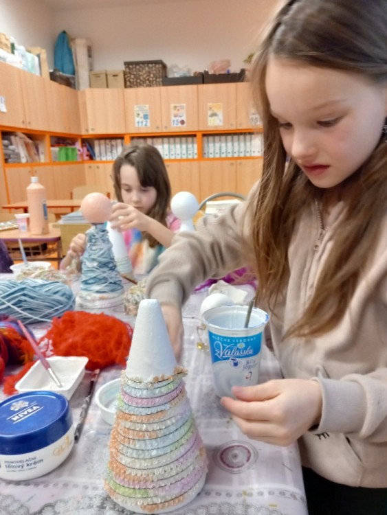 Z polystyrenových kuželů tvoříme vánoční dekorace, stromeček a anděla. Na kužel natřeme lepidlo, omotáme vlnou a pomocí tavné pistole zdobíme vánočními motivy a korálky. Práce se nám daří a moc nás baví, budeme v ní pokračovat až do Vánoc. Materiálu, chuti do tvoření a dobré nálady máme stále dost :-)