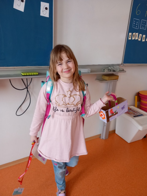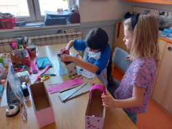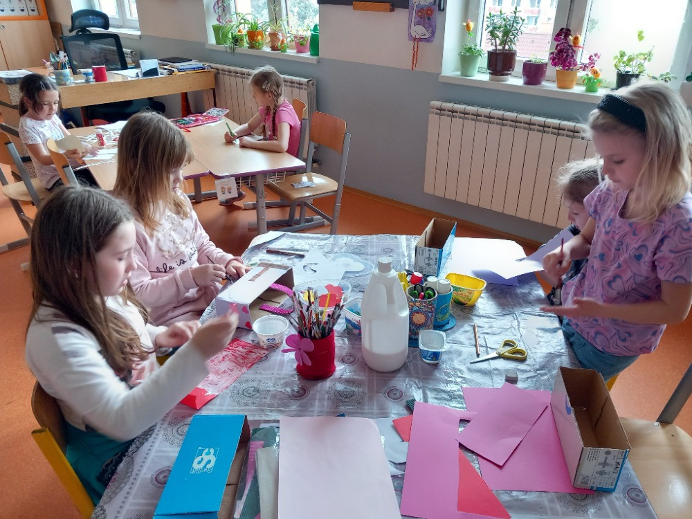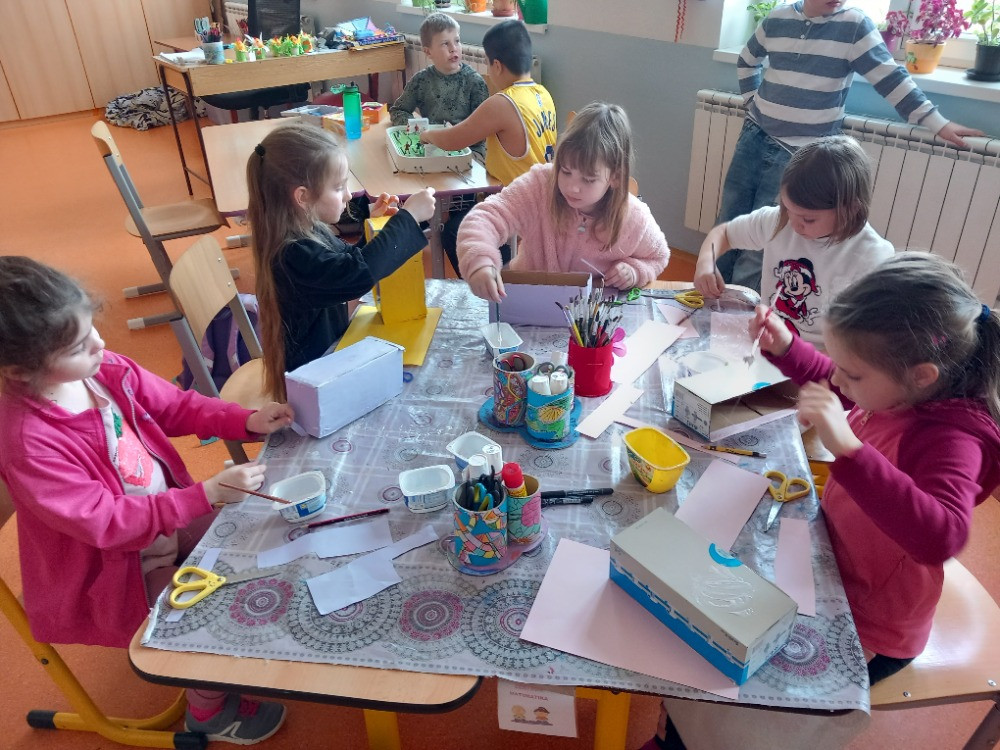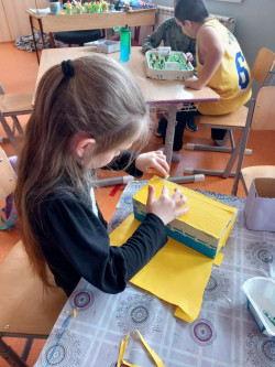 Ze starých nevyužitých krabiček tvoříme velikonoční košíčky. Polepujeme je barevným papírem, zdobíme tvary a korálky, vystřihujeme ptáčky, pod dohledem pracujeme s tavnou pistolí, 4. ročník.