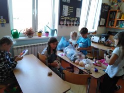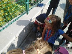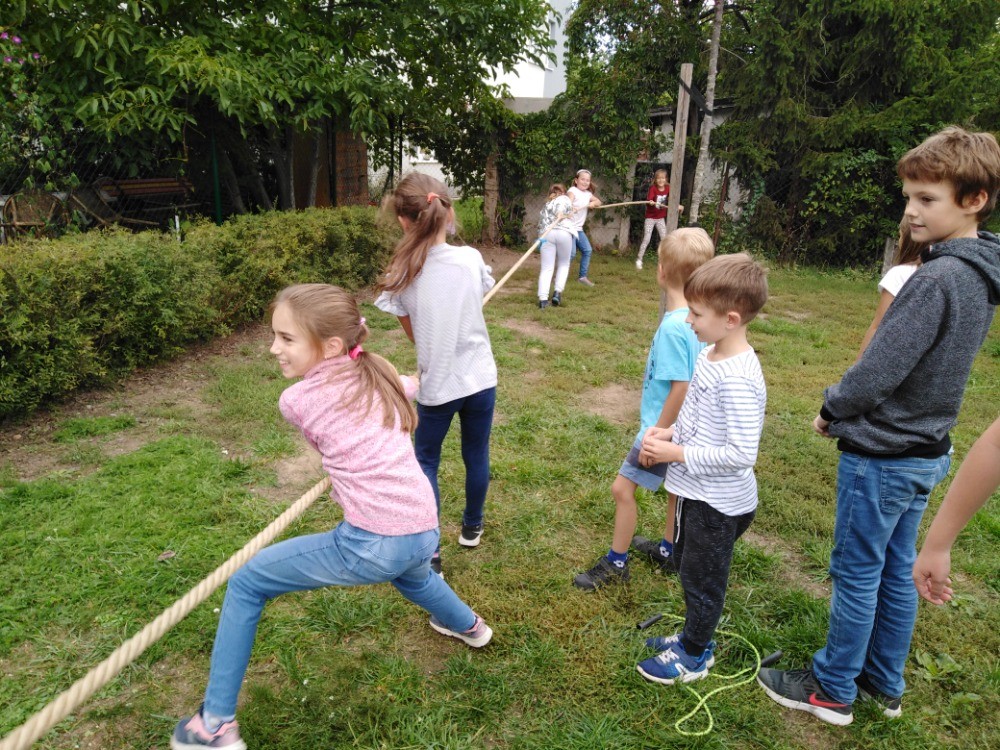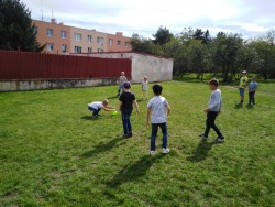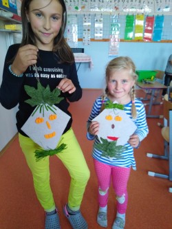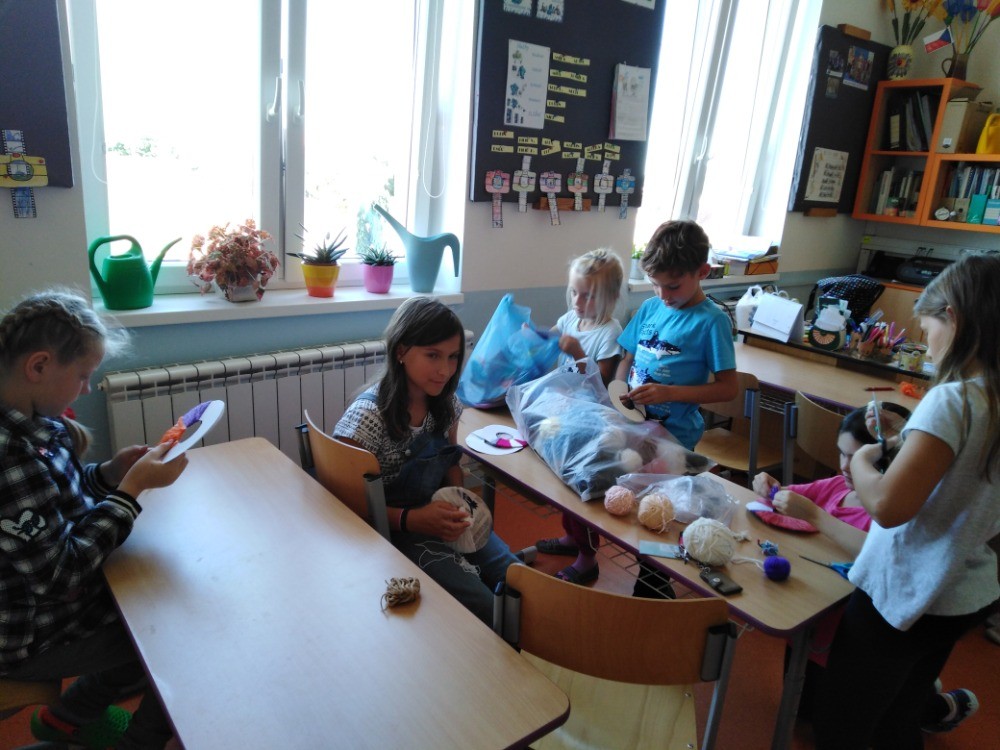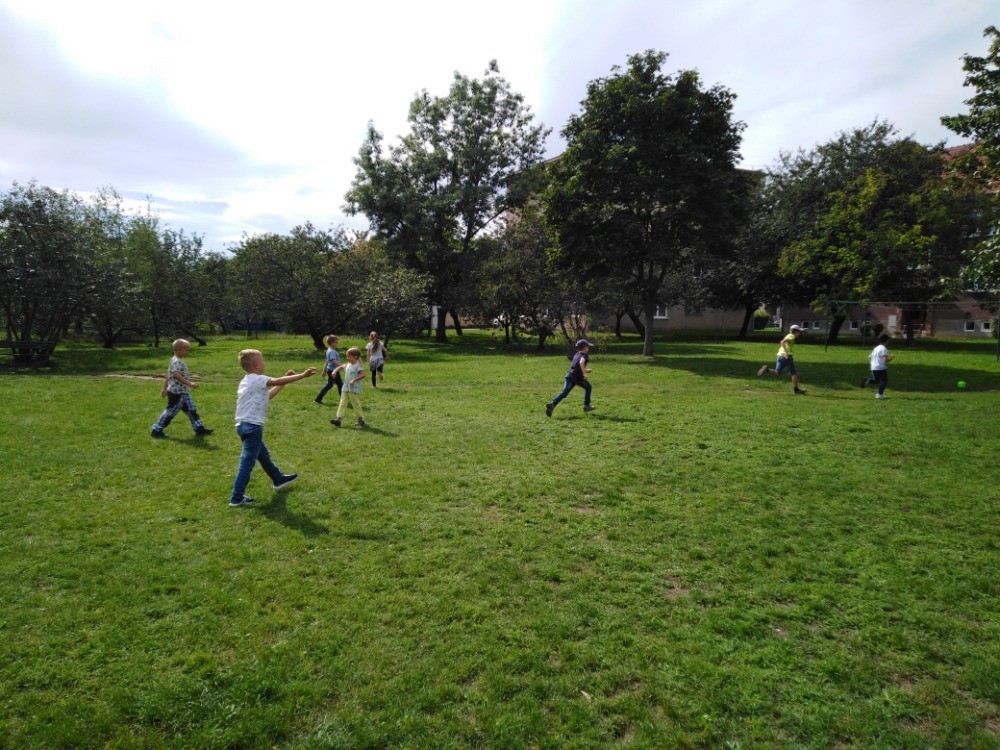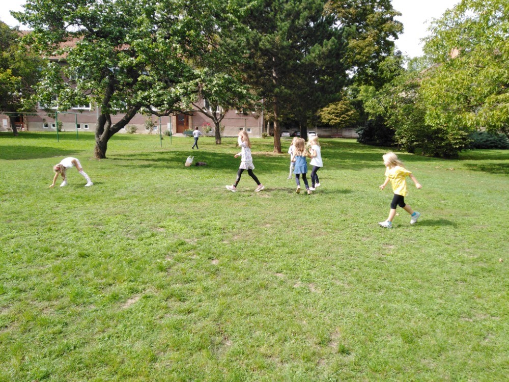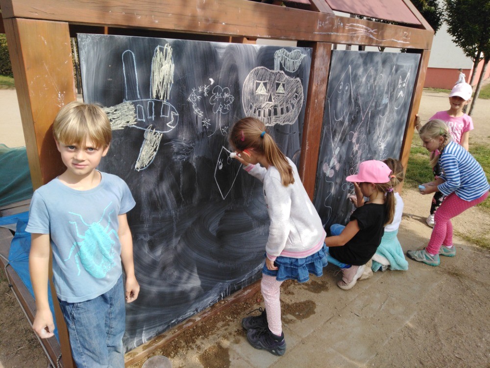 Každý den využíváme krásného podzimního počasí k venkovním aktivitám - hrajeme vybíjenou, malou kopanou. Přetahujeme se,malujeme na tabuli a pozorujeme dění u jezírka i v okolí školy. Ze zbytků látek tvoříme závěsné draky na dveře, které se nám moc povedly :-)