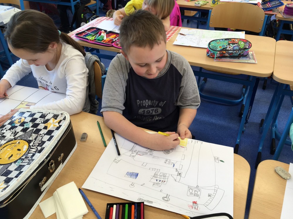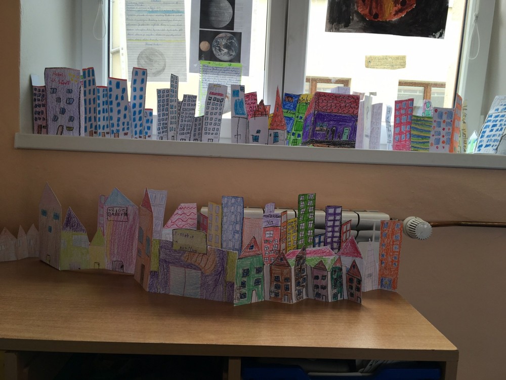 Ve třetí třídě jsme se psolední dobou věnovali budovám. Kreslili jsme si návrh doma a podobu své vesnice. Pomocí frotáže jsme zjišťovali, z jakých materiálů jsou budovy stavěny a nakonec jsme si navrhli naše vlastní město. Ukázku z prací můžete vidět níže.