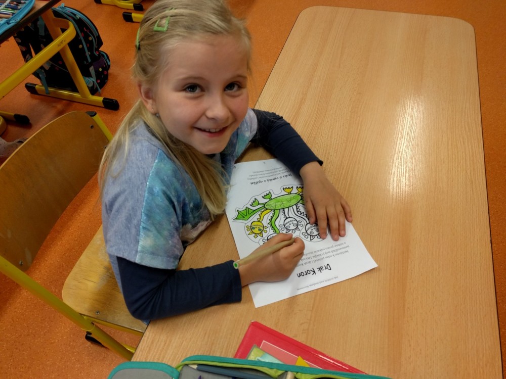 Plníme stejné úkoly z českého jazyka,matematiky i prvouky jako naši spolužáci doma, ale  stíháme i něco navíc. Celý minulý týden jsme bojovali s drakem Koronem.Připomínali jsme si pravidla, kterými se musíme řídit, abychom nad zlým drakem zvítězili.