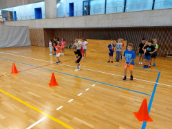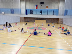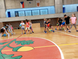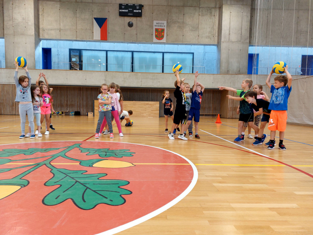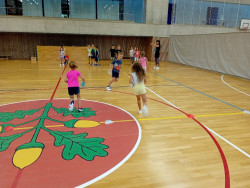 Bez nástupu a zahájení hodiny pozdravem to snad ani nejde. I rozcvička musí být a dál už soutěžně a zábavně, alespoň pro začátek. V dalších hodinách nás čeká nácvik hodu horním obloukem, ten ještě někteří nezvládáme, a můžeme se pustit do míčových her. Vedeme si dobře, pohotově reagujeme na povely paní učitelky. Ta z nás má radost.