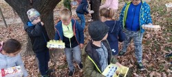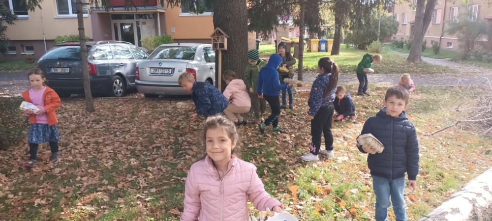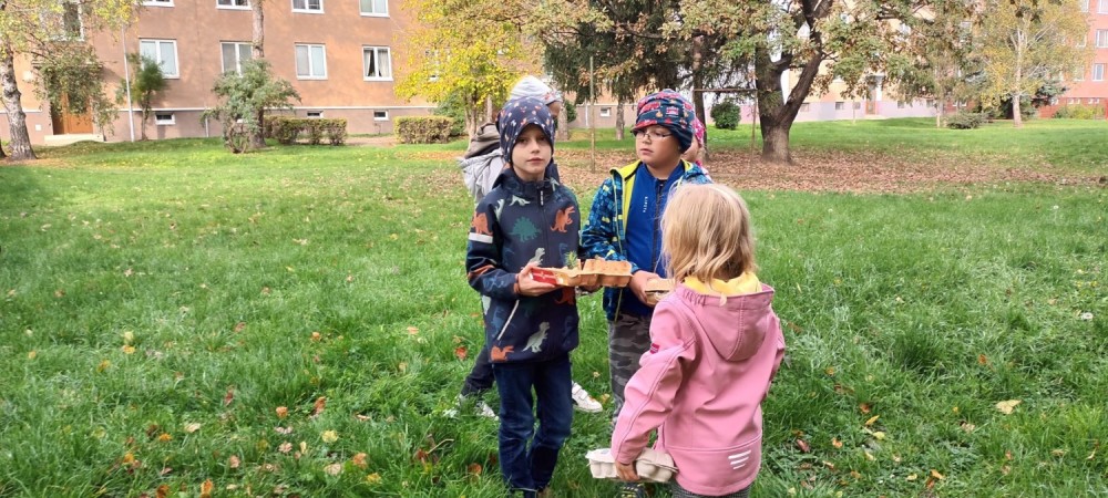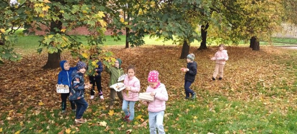 Procházka po okolí školy se stala honbou za pokladem podzimních přírodnin - kaštan/jírovec, žalud/dub, listy, kámen, kůra, větev, jehličí, šiška, javor a šípek. Každé dítě si vytvořilo pokladničku z obalu na vajíčka a cílem bylo zaplnit ji. Když si tyto kousky přírody samy vypátraly a uložily do pokladničky, snáze si zapamatují jejich názvy a poznají je. Děti byly mnohem pozornější, vnímavější k přírodě a svému okolí.